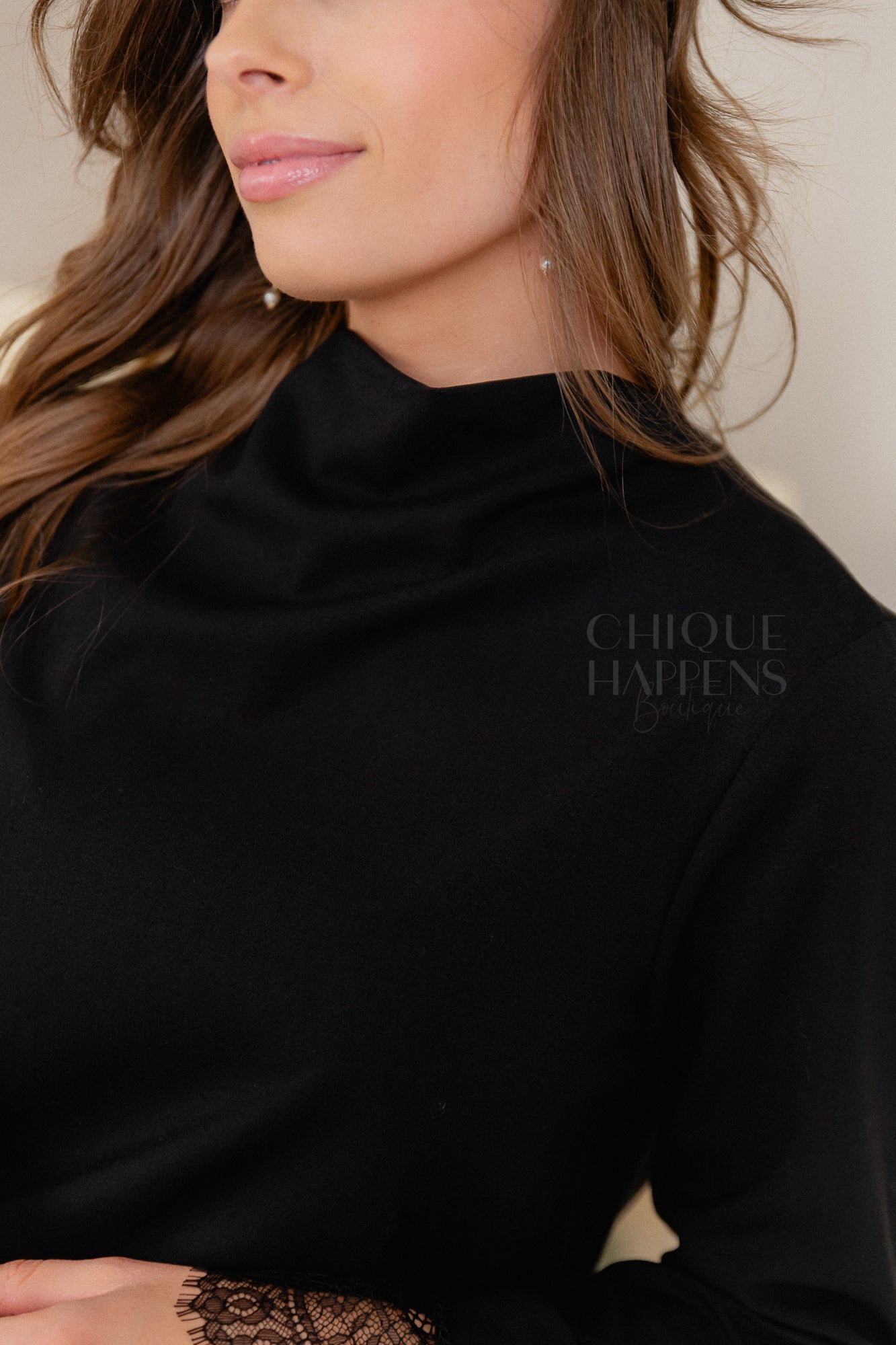 Een zwarte watervalblouse met delicate kanten mouwdetails — élégant en chique, perfect om elke outfit verfijnd af te werken!