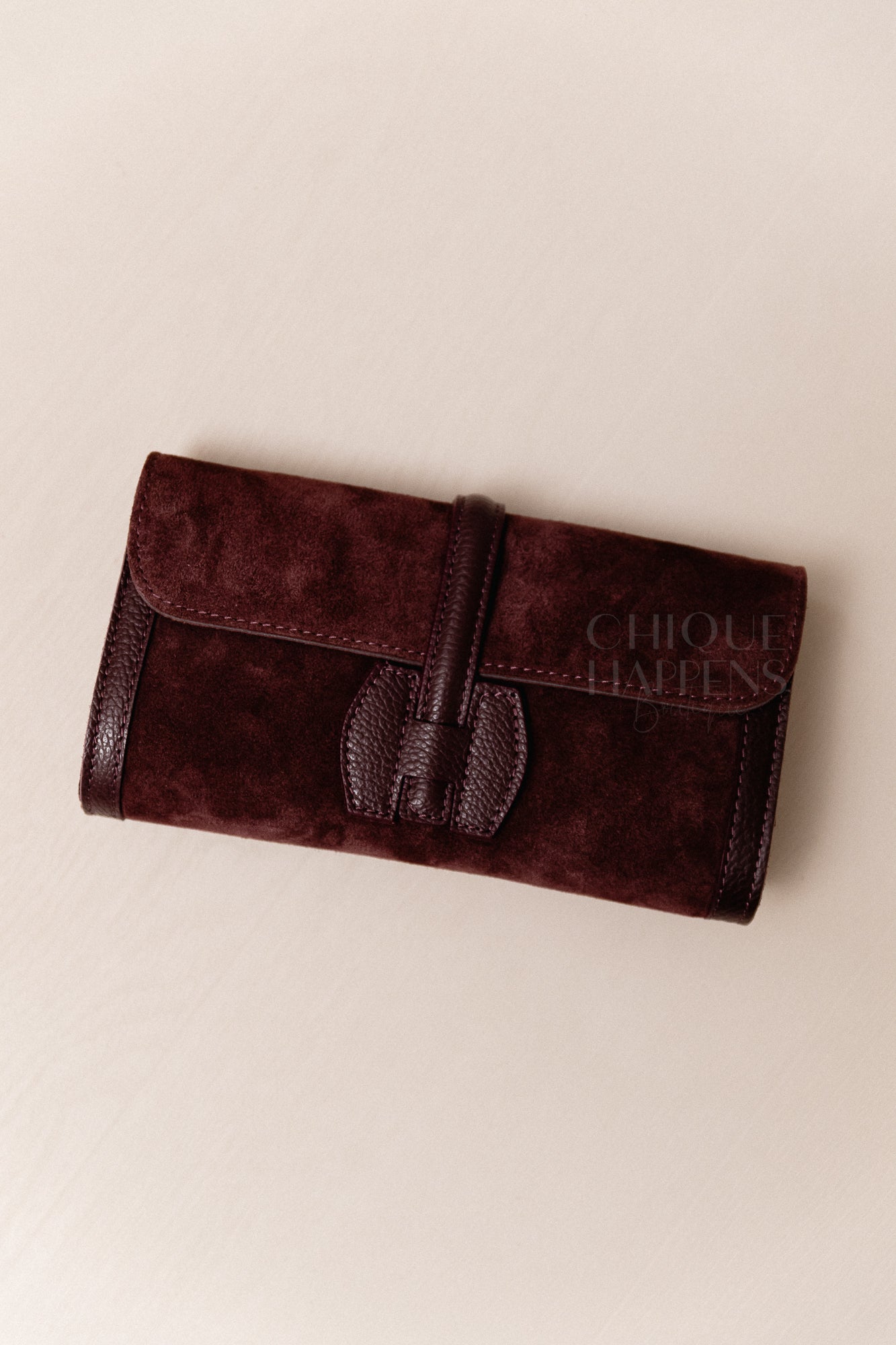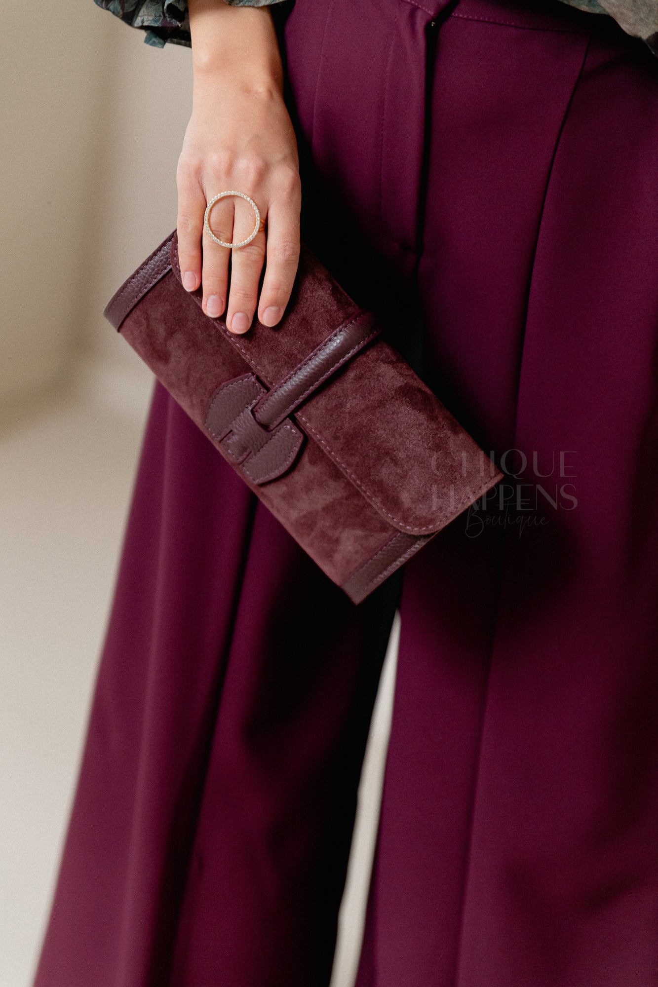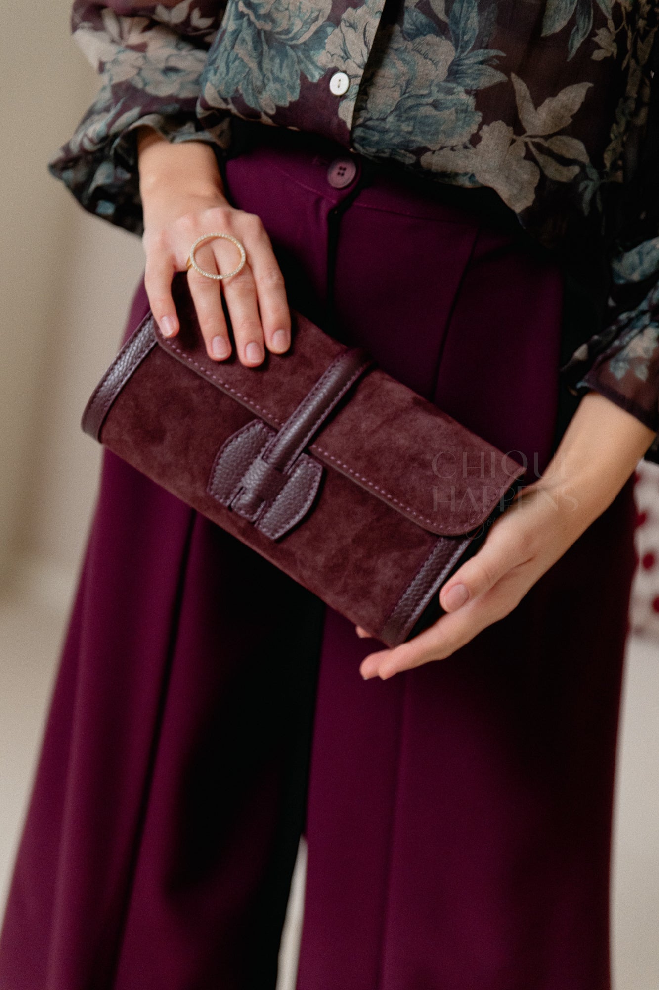 Stijlvolle burgundy clutch in fijn suèdeleder met prachtige accenten. Een tijdloos accessoire dat elke outfit een verfijnde, chique touch geeft.