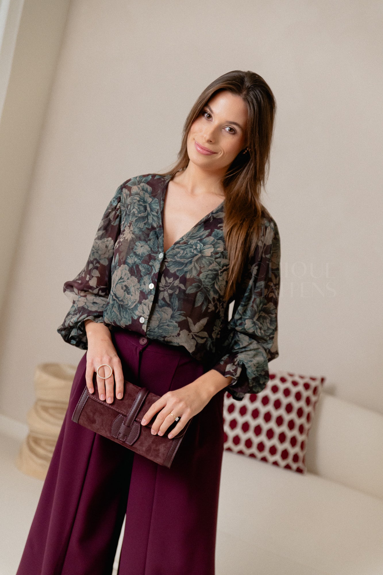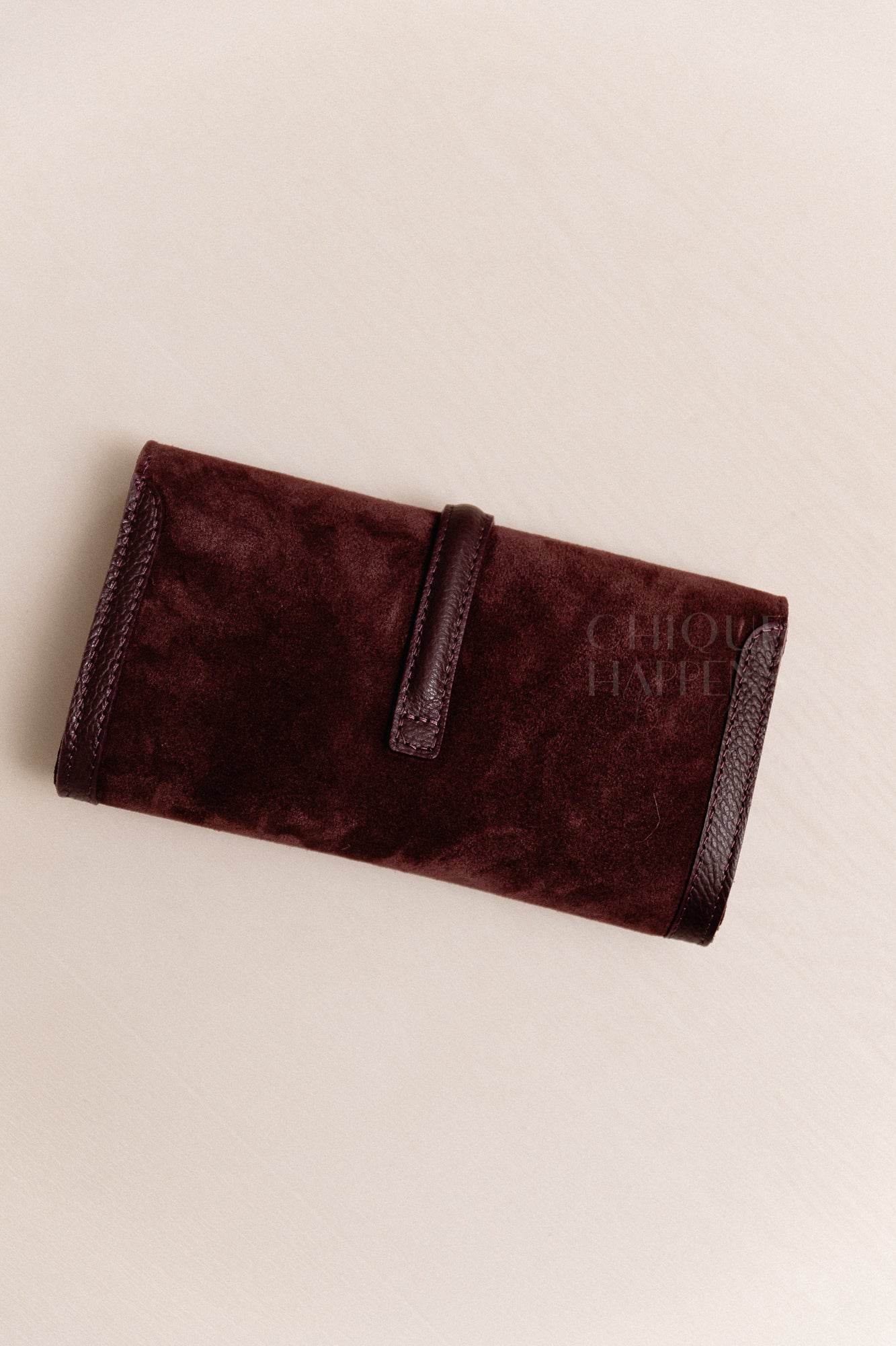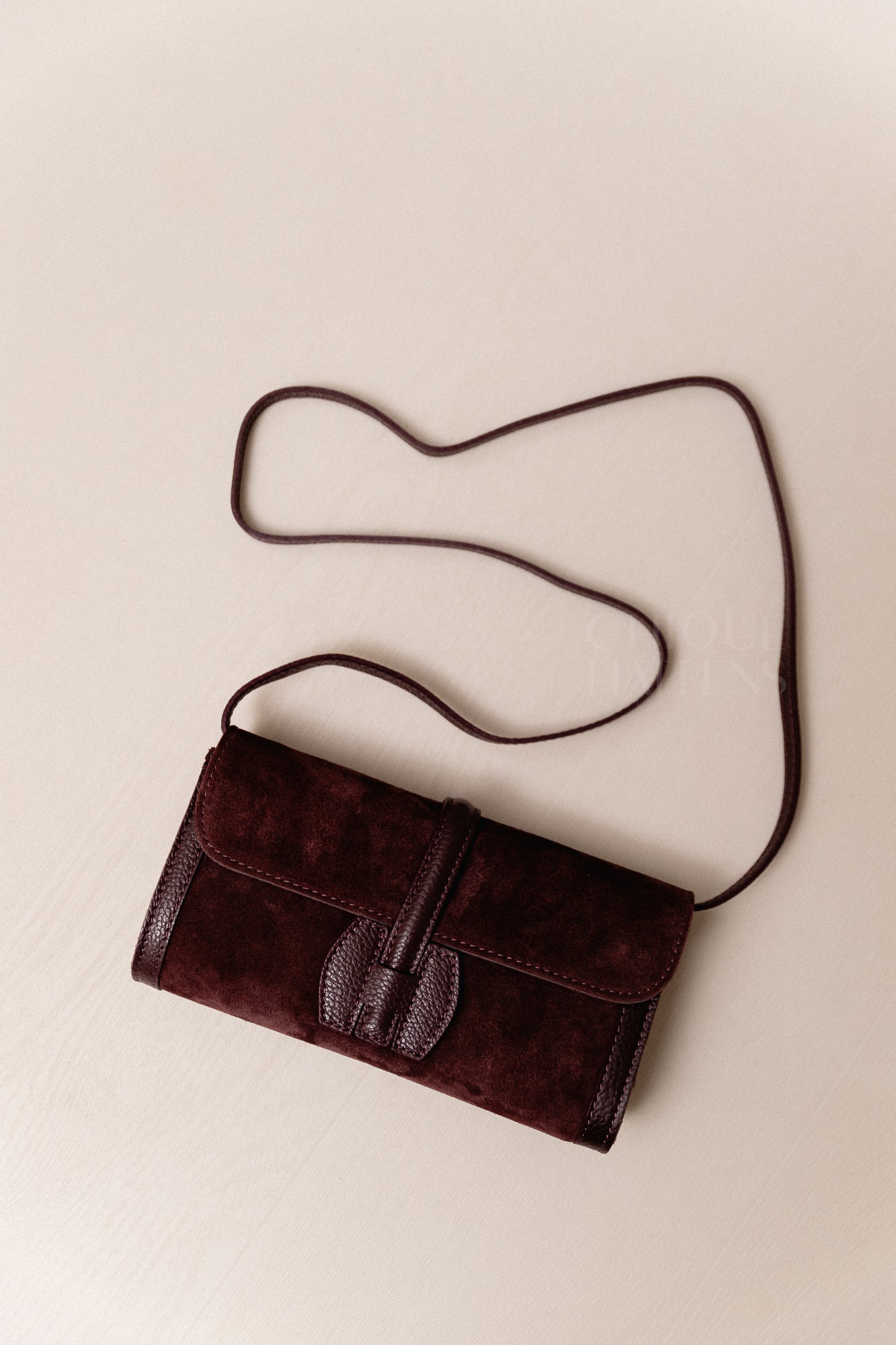 Stijlvolle burgundy clutch in fijn suèdeleder met prachtige accenten. Een tijdloos accessoire dat elke outfit een verfijnde, chique touch geeft.