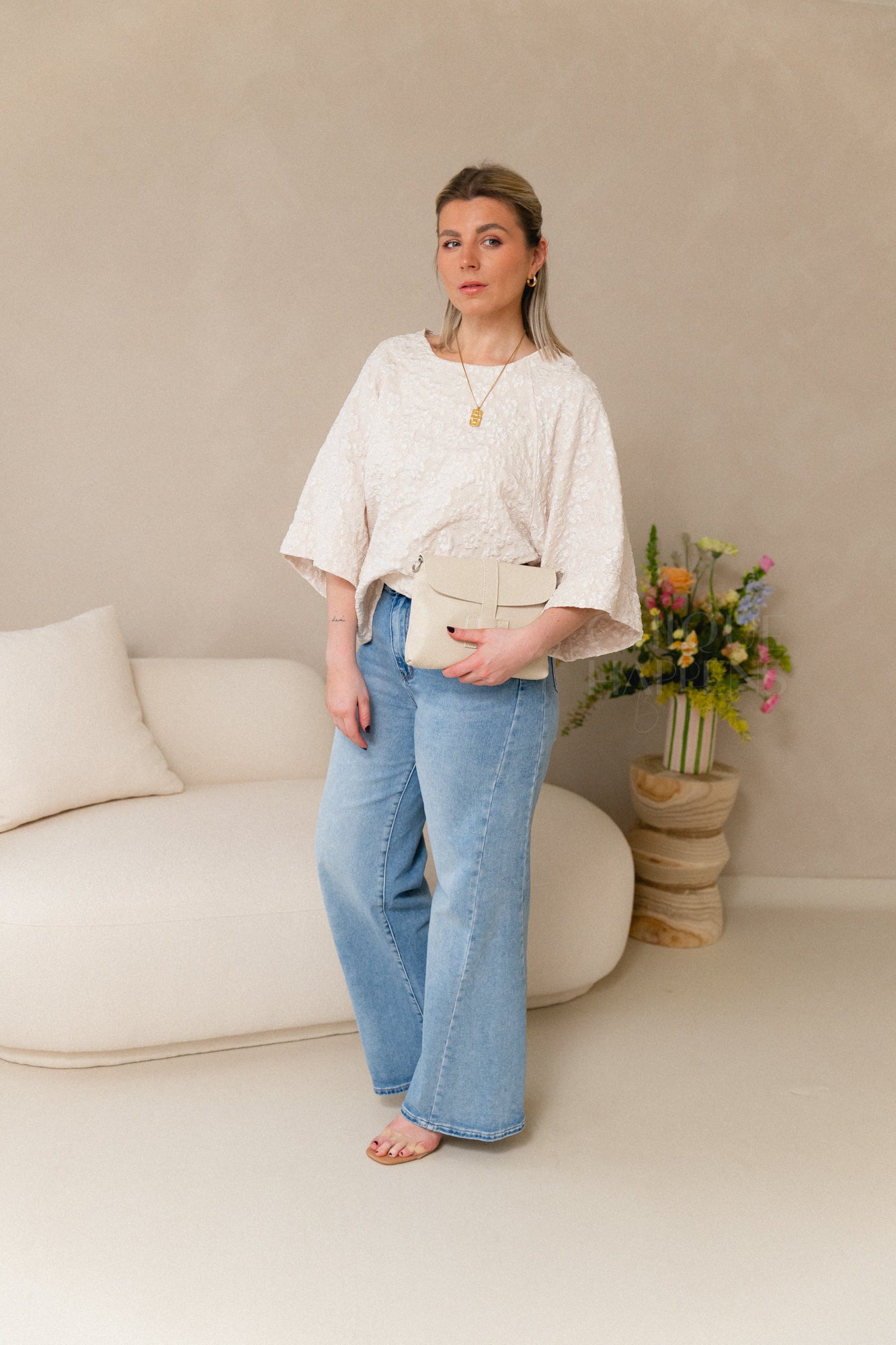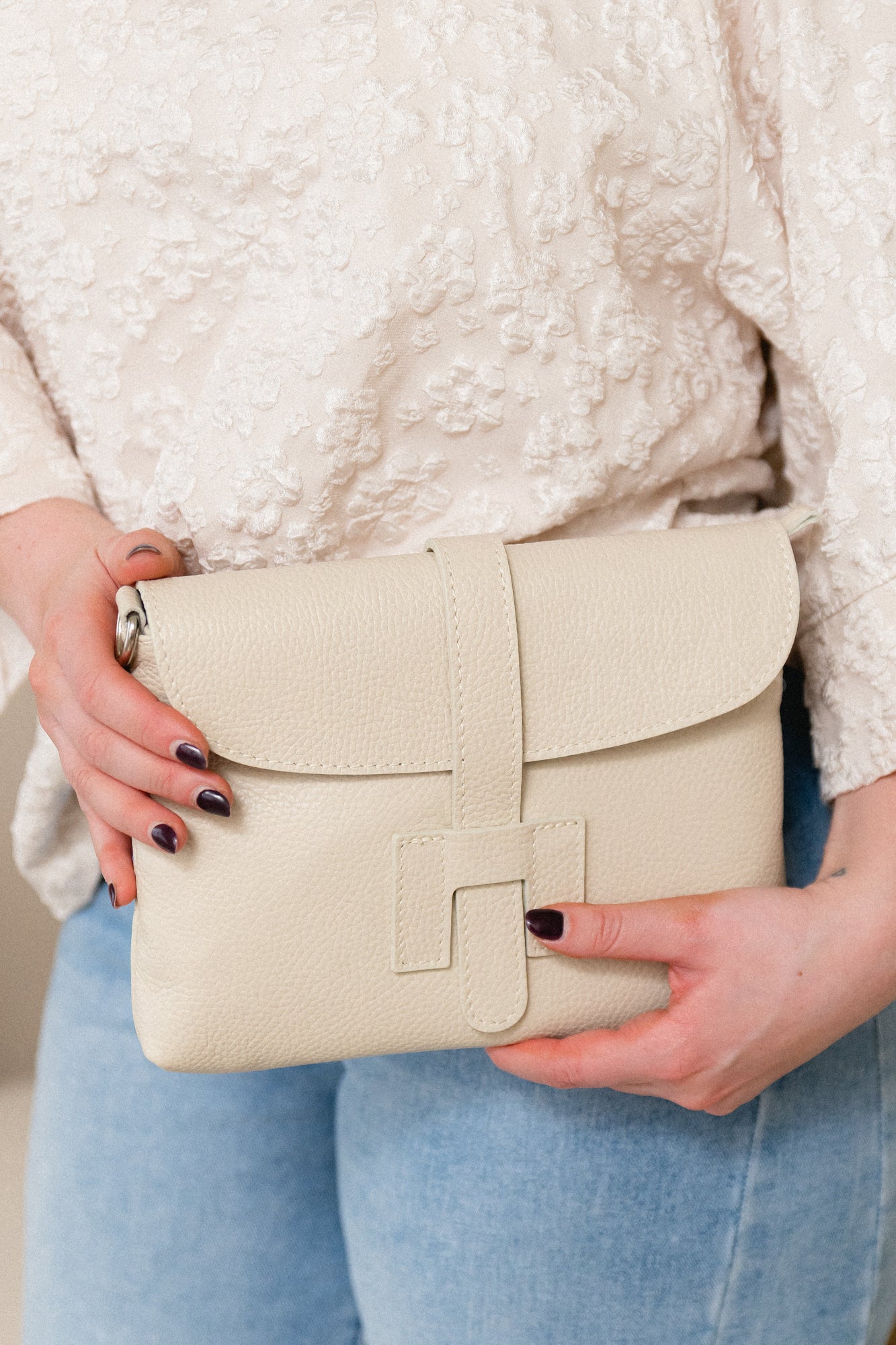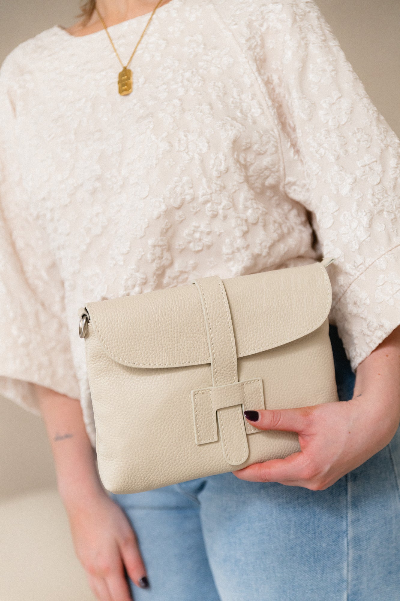 Leuke beige clutch. Er komt een riempje bij om de tas crossbody te kunnen dragen.