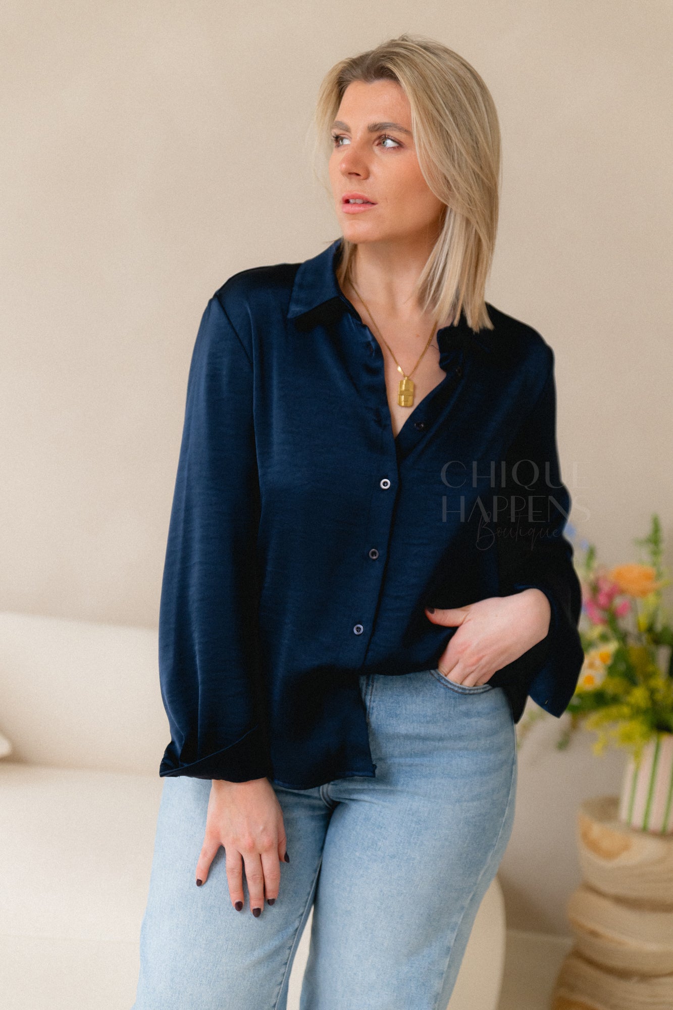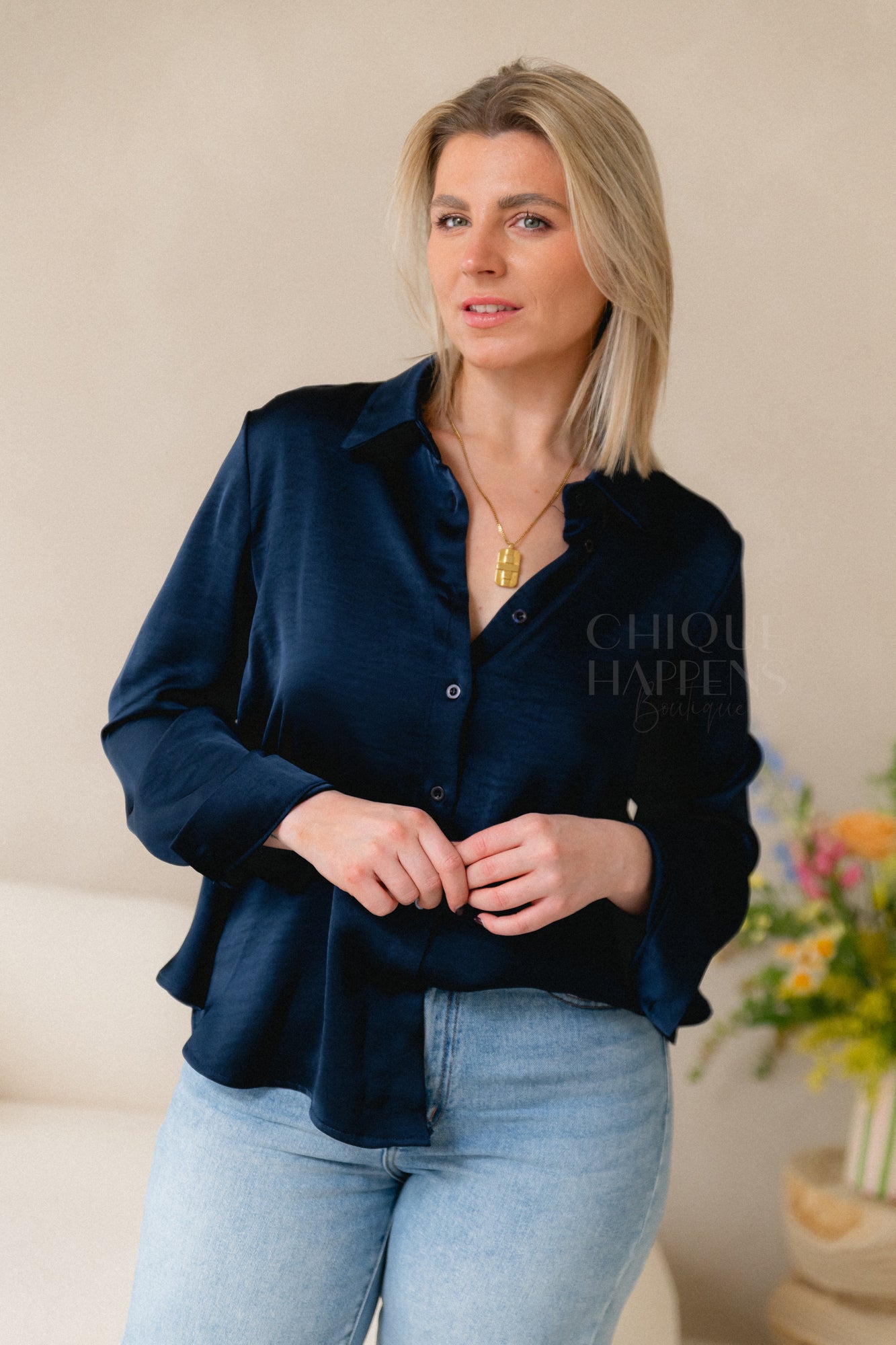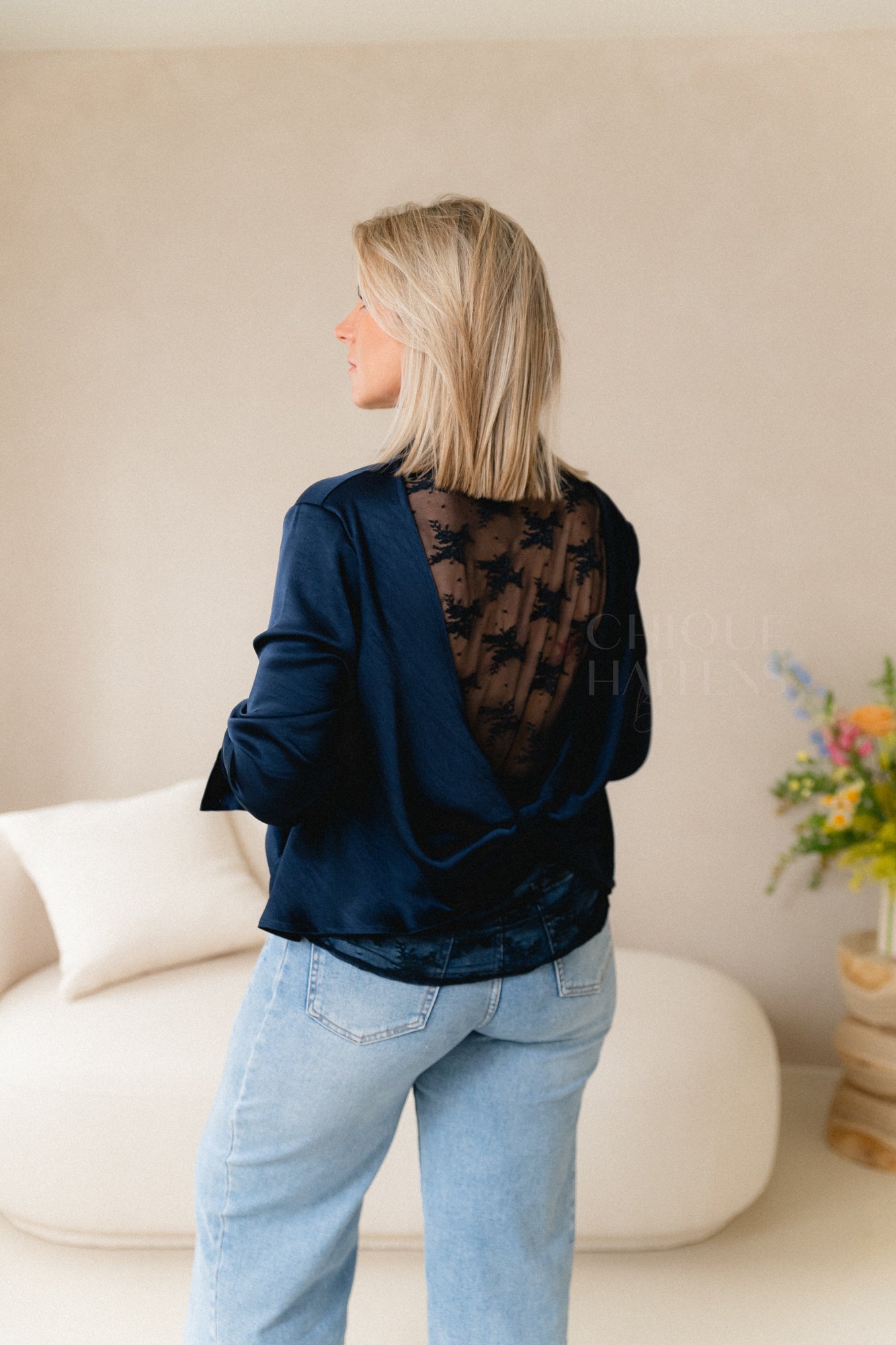 Een luxe satijnlook blouse in tijdloos navy blauw, met een opvallende achterkant van delicate kant en een elegant strikdetail. Perfect voor een verfijnde, vrouwelijke touch bij elke gelegenheid.