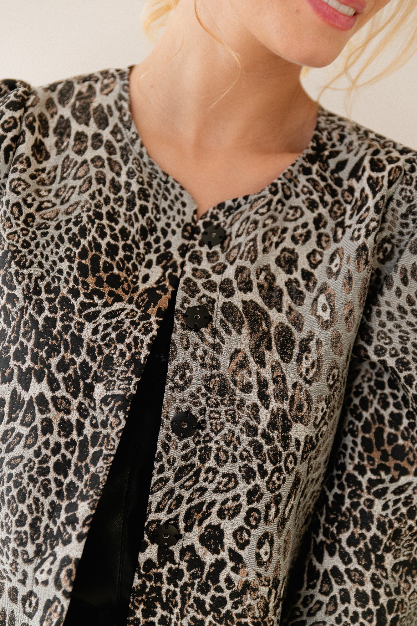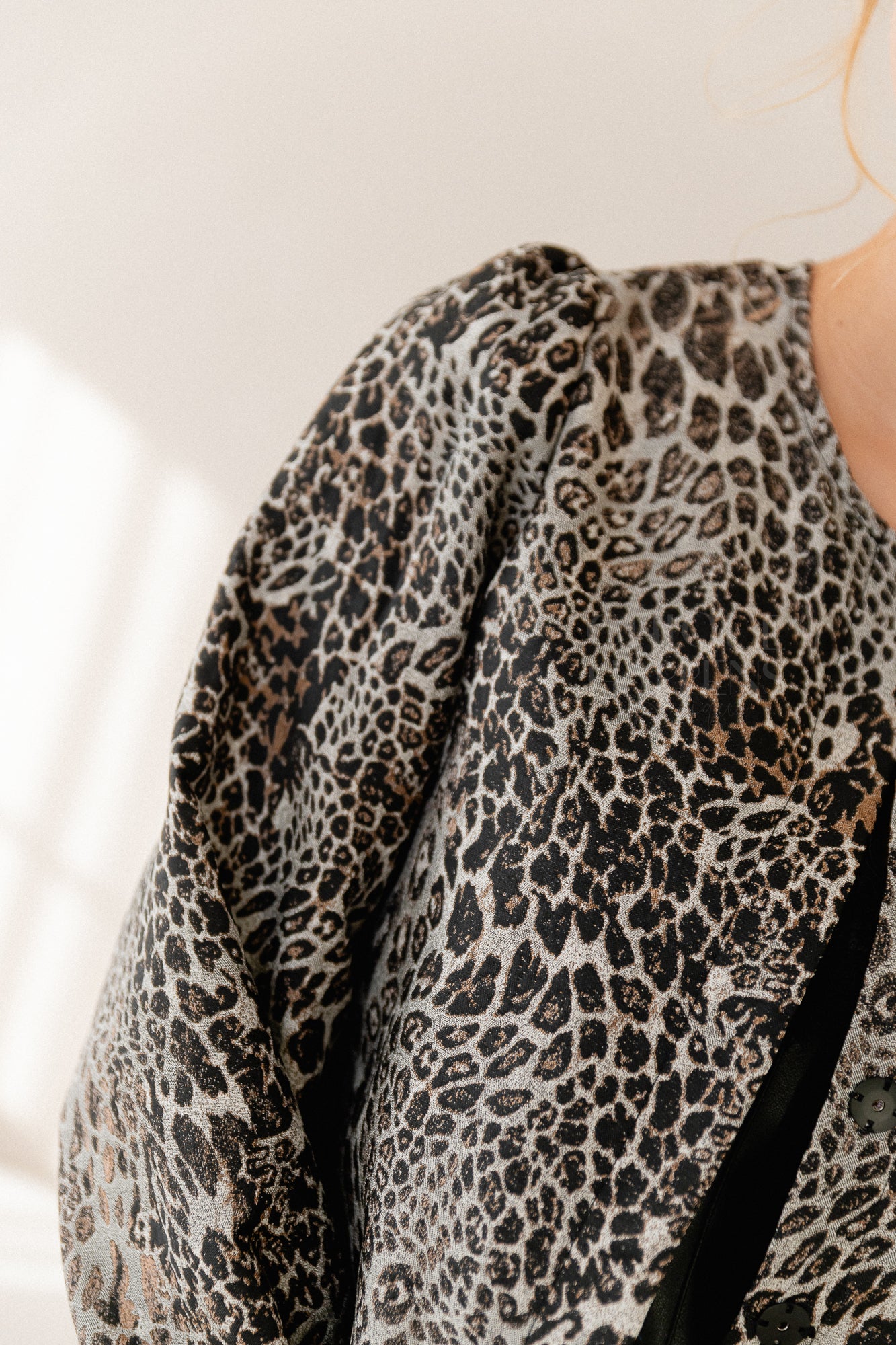 Een zwart-grijze blouse met panterprint. De blouse is gemaakt van jacquard stof, heeft een hoge ronde hals, blinde drukknopen en subtiele pofmouwen met elastiek bij de mouwuiteinden. De blouse met print is zowel dicht als blouse, maar ook open als jasje te dragen!