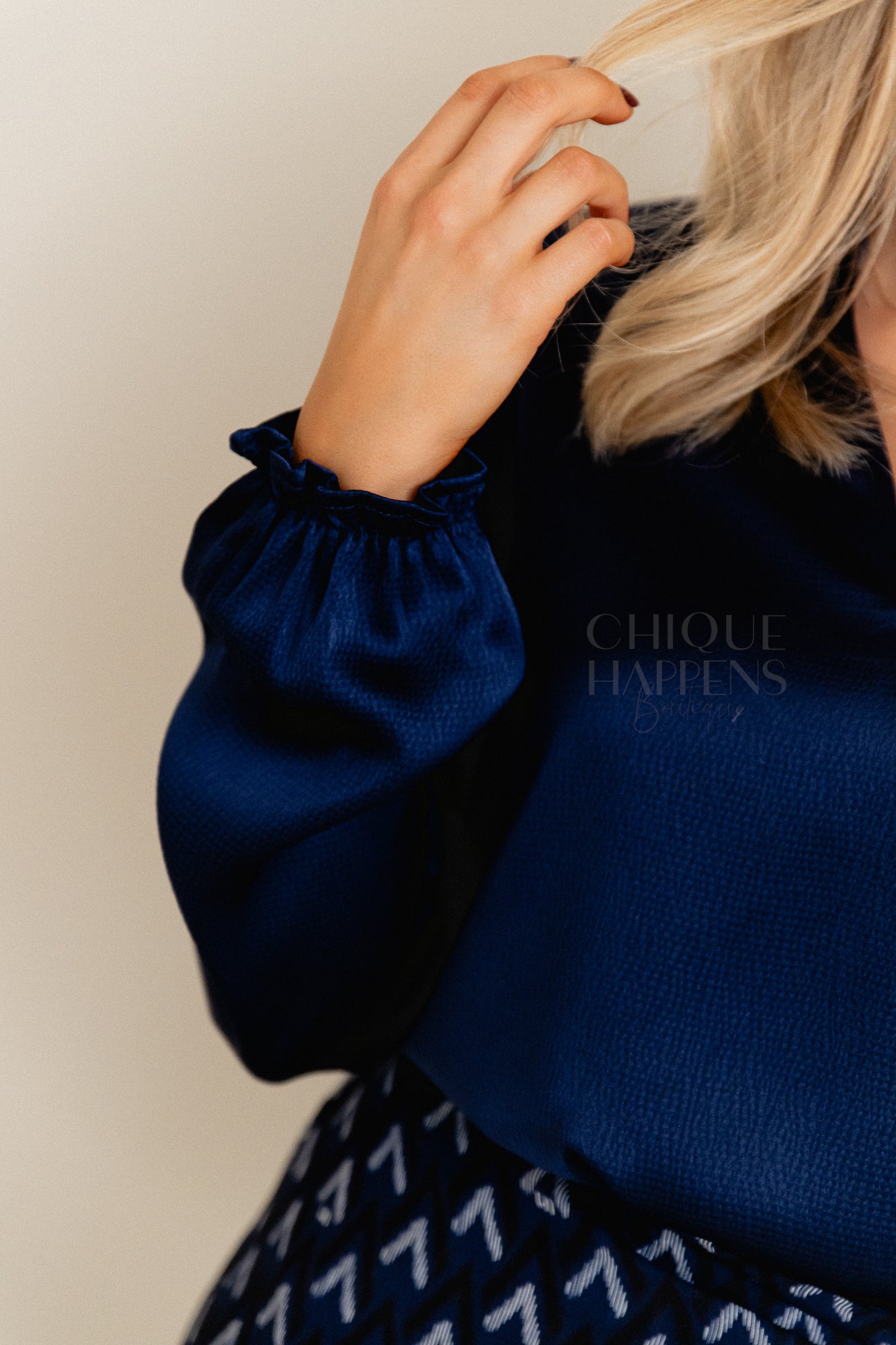 Blauwe blouse met satijnachtige look. De blauwe blouse met V-hals heeft ruffles bij zowel de kraag als mouwuiteinden. De blouse is qua pasvorm rechtvallend.