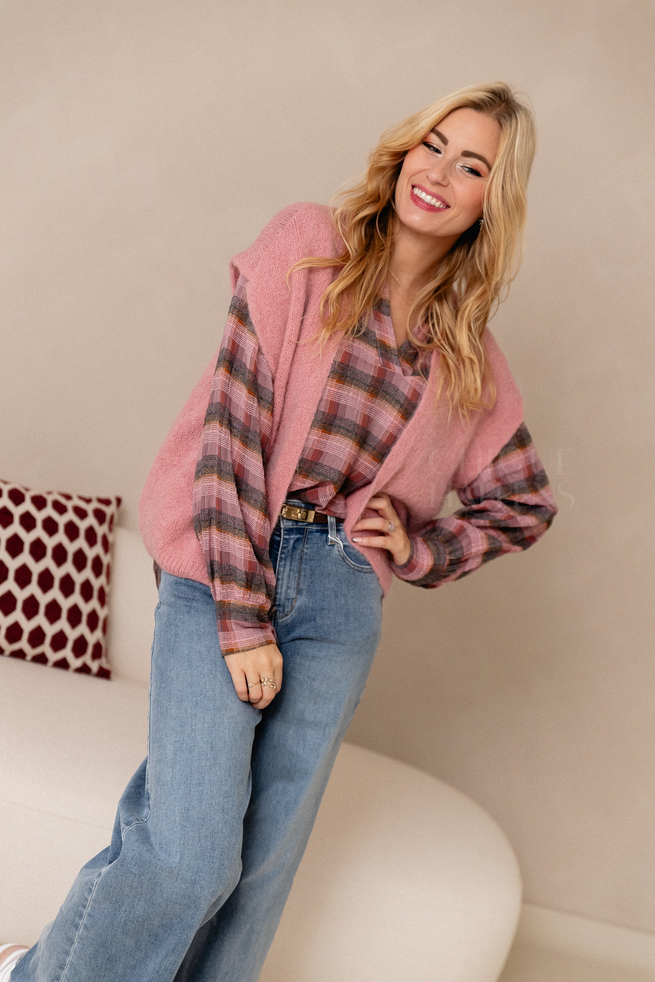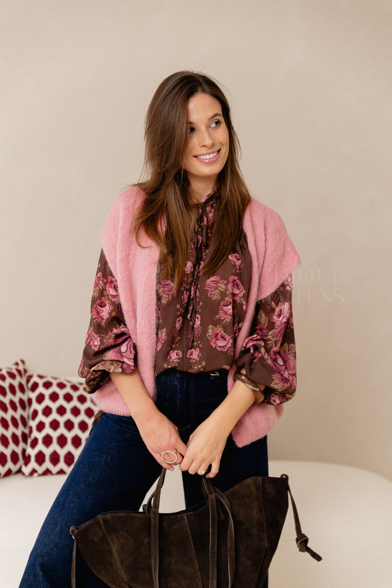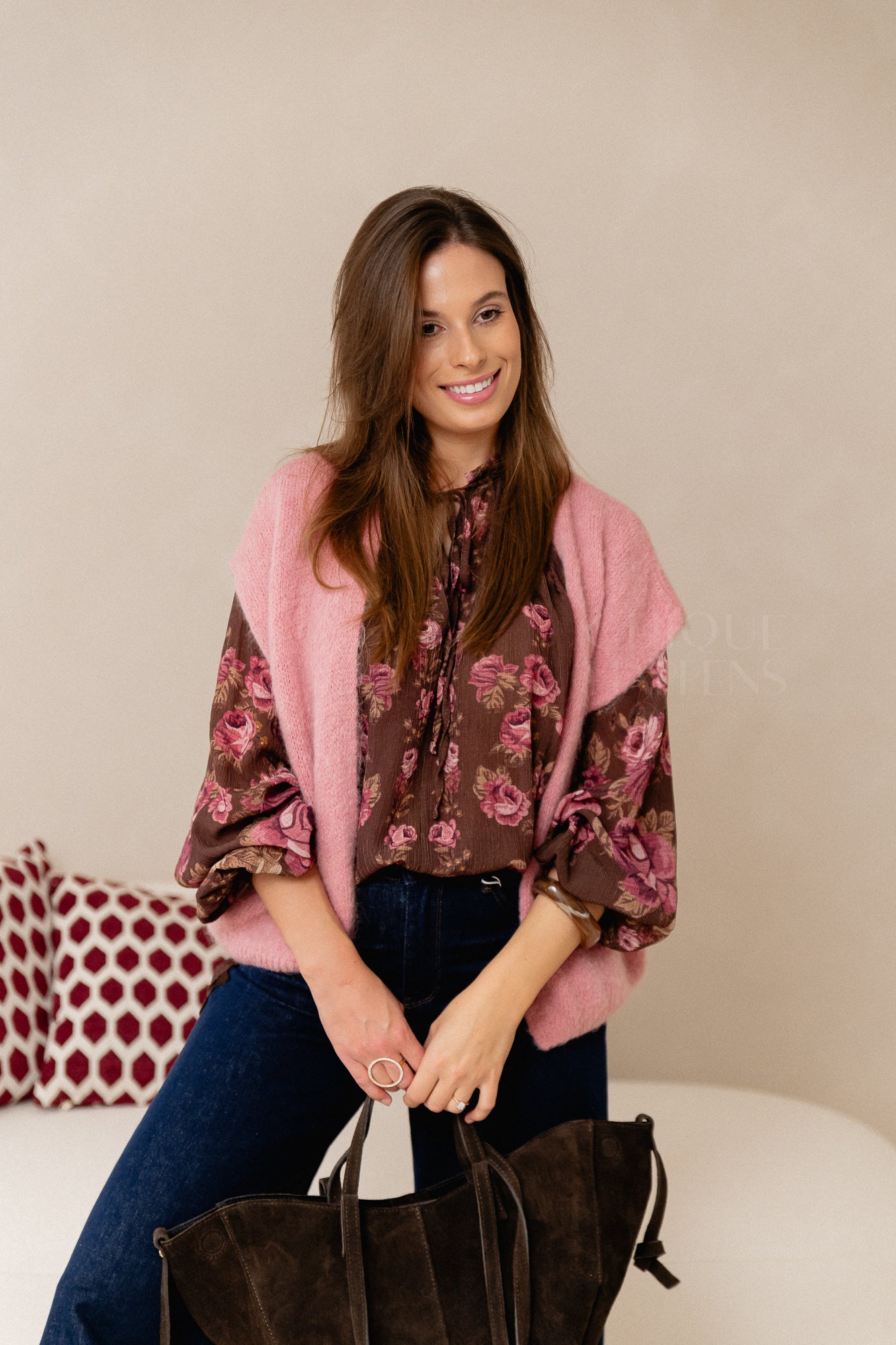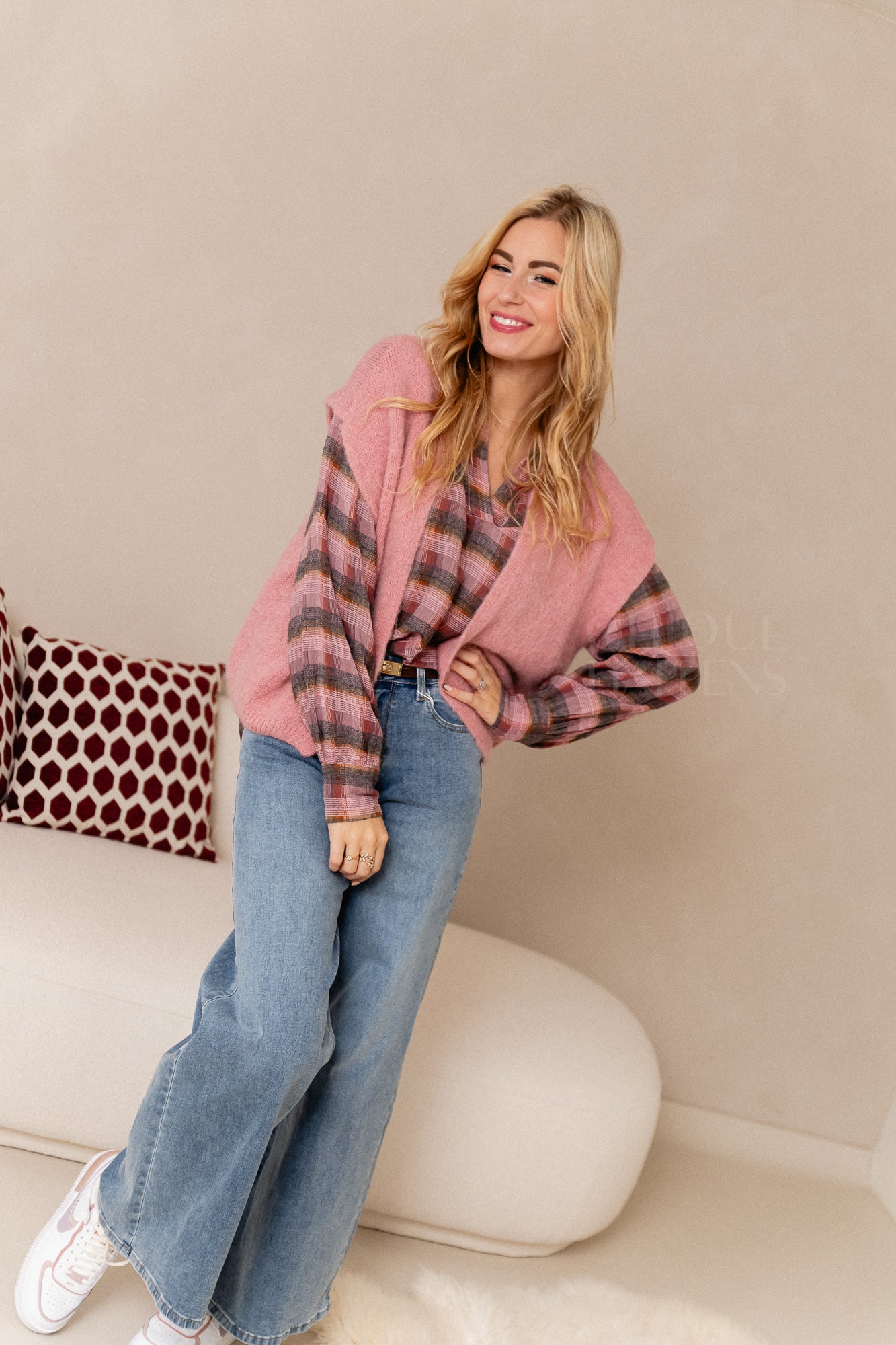 Mouwloze knit in zacht roze, perfect om over blouses te dragen. Licht en comfortabel, tijdloos en makkelijk te combineren.