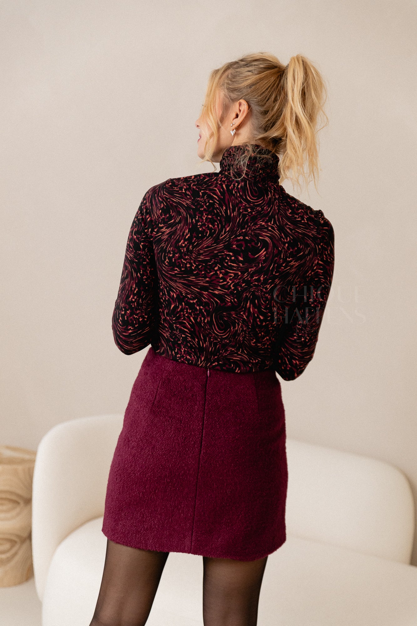 Een zachte, aansluitende turtle neck blouse met swirl print en veel stretch voor optimaal draagcomfort. Het is aan te raden een maatje groter te nemen voor de perfecte pasvorm. Ideaal te combineren met het Brunello Suitje of het Tweed Burgundy Vestje voor een stijlvolle, veelzijdige look.