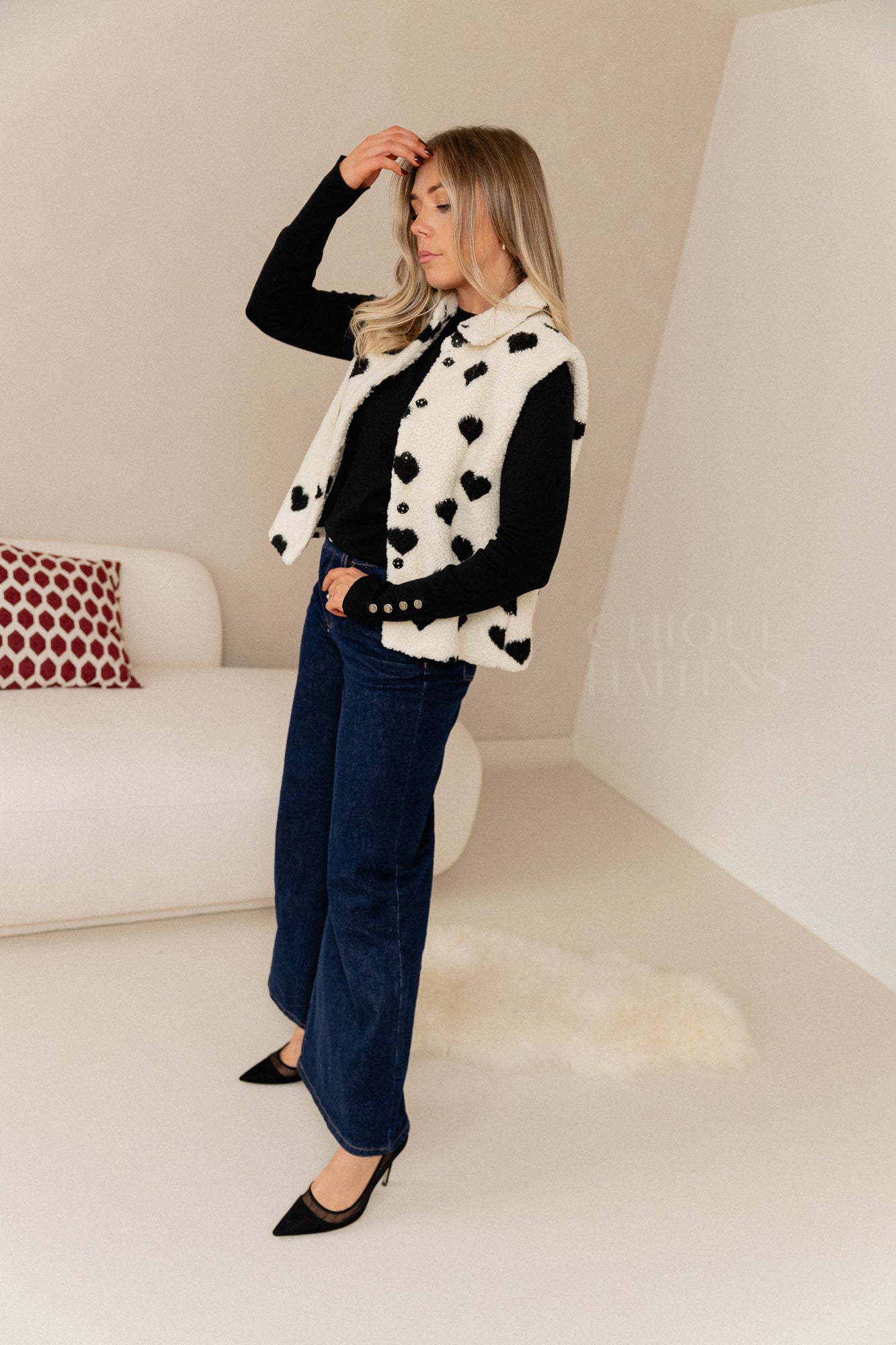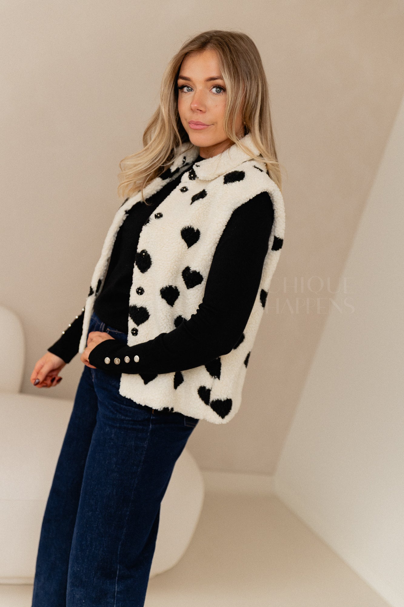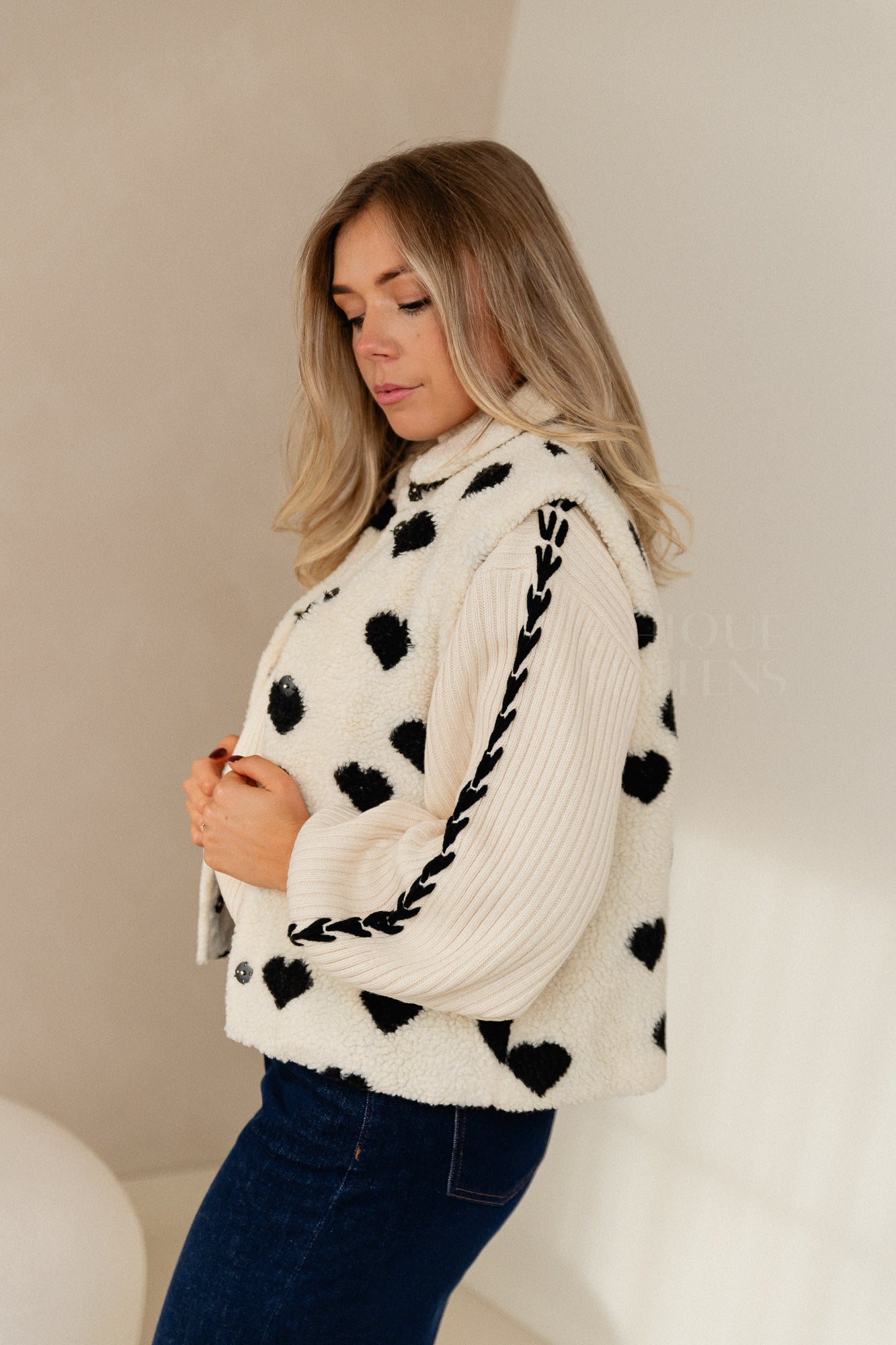 Een beige gilet met hartjesprint. Het beige gilet is gemaakt van een zachte teddy stof en heeft steekzakken en een blinde knoopsluiting. Verder heeft het jasje een klassieke kraag en is het gilet qua pasvorm rechtvallend.