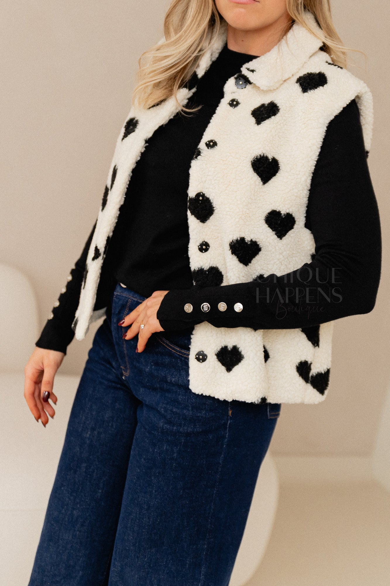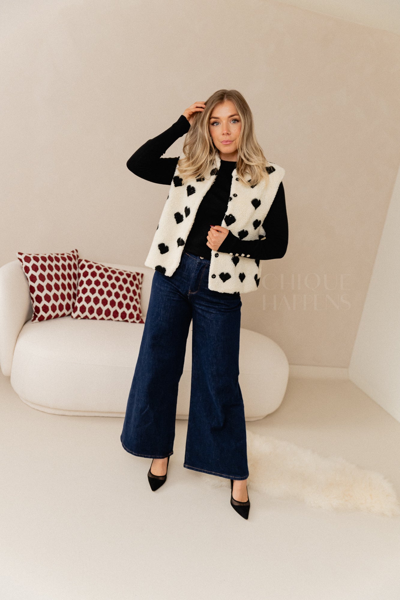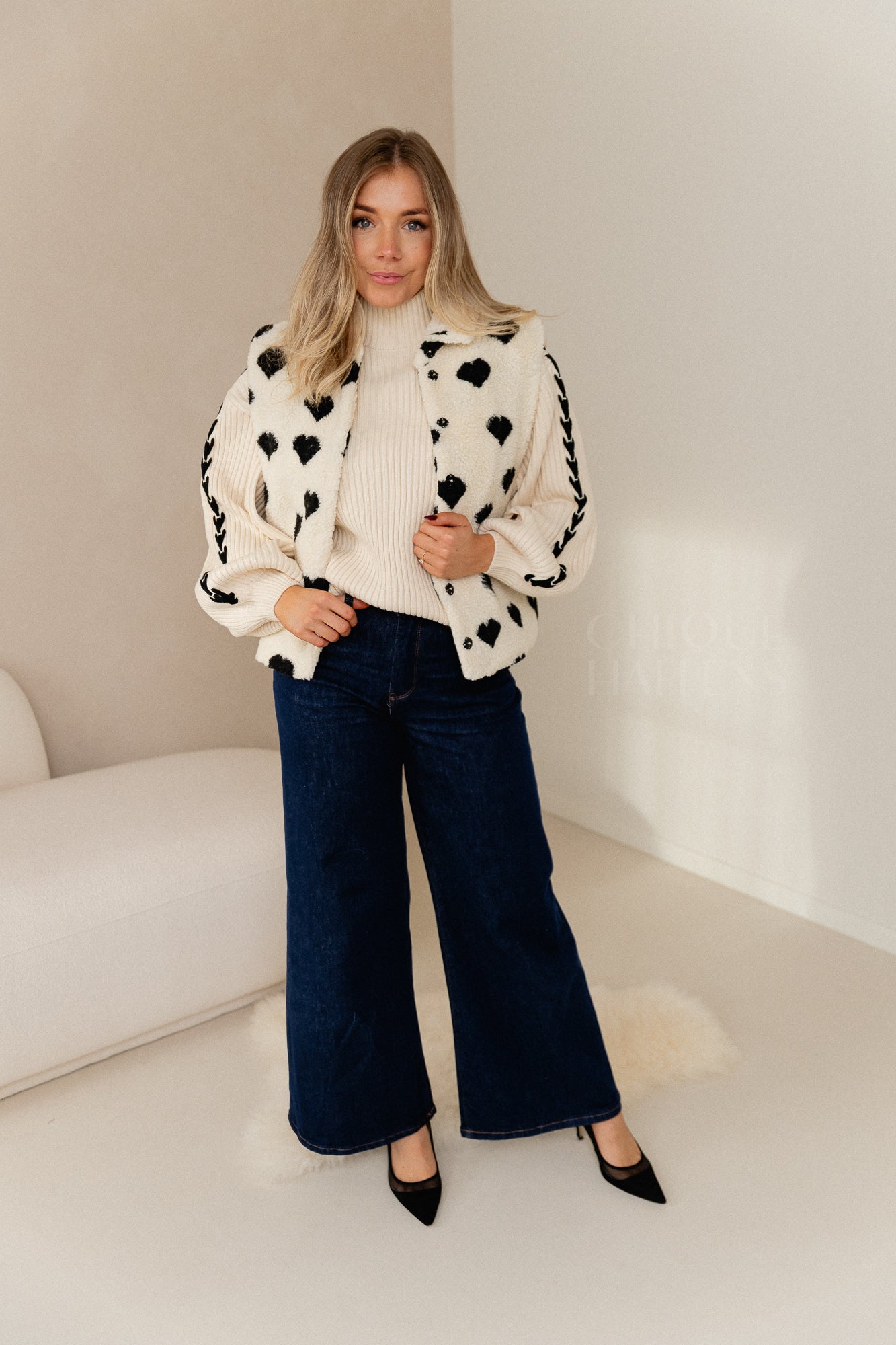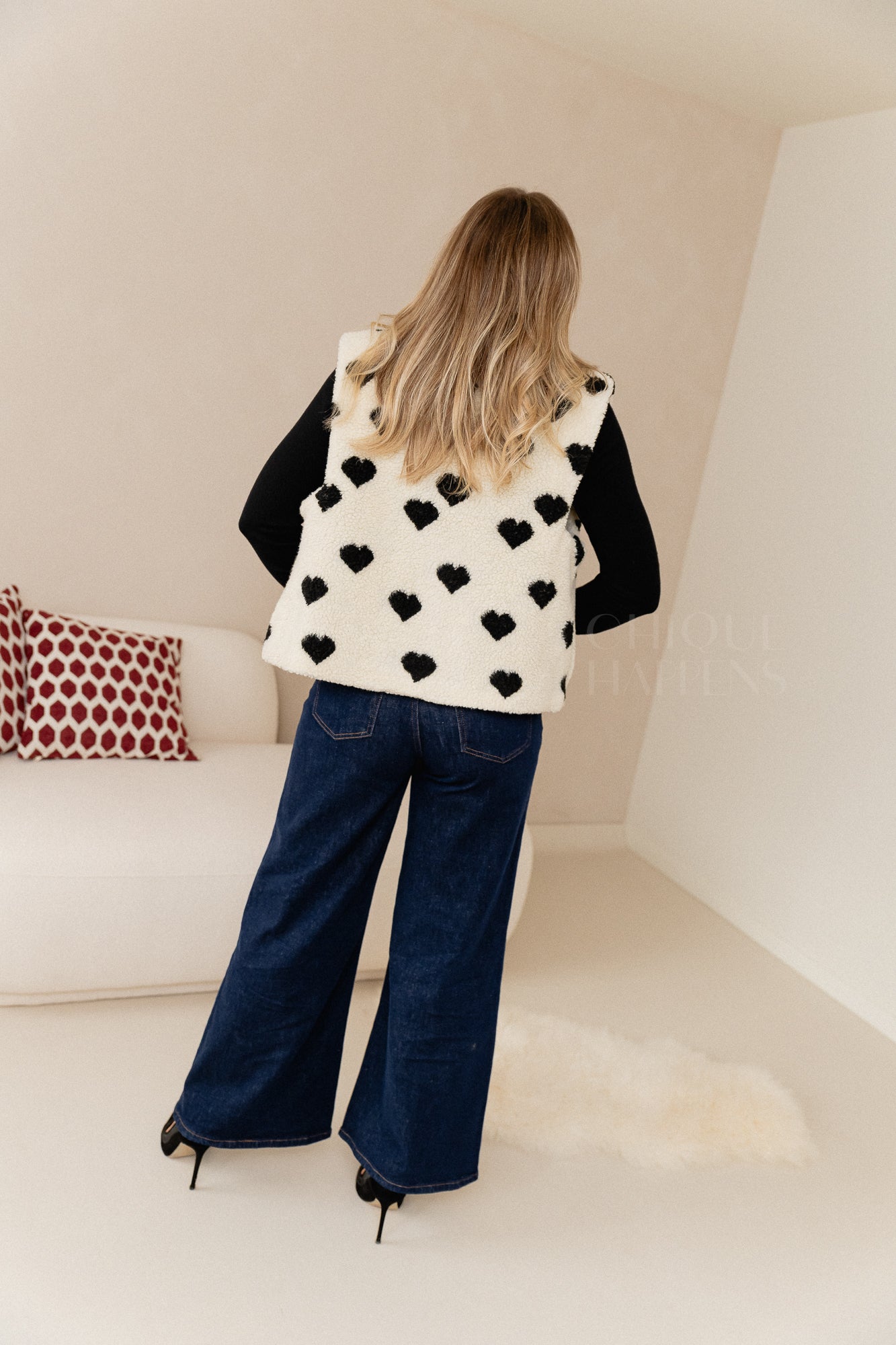 Een beige gilet met hartjesprint. Het beige gilet is gemaakt van een zachte teddy stof en heeft steekzakken en een blinde knoopsluiting. Verder heeft het jasje een klassieke kraag en is het gilet qua pasvorm rechtvallend.