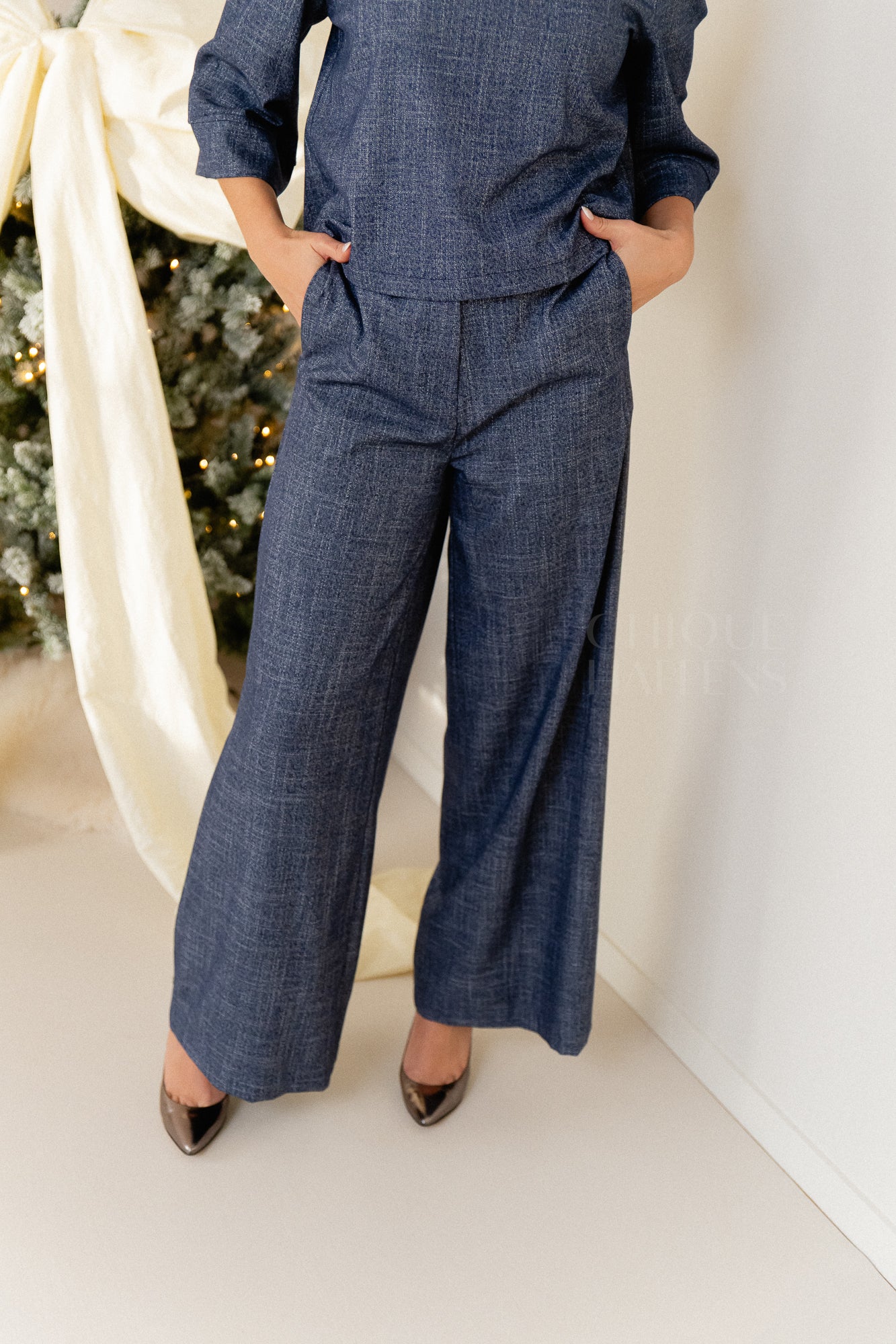 Prachtige set van chique stof: een elegante top en broek die perfect samen een stijlvolle, verfijnde look creëren. Ideaal voor op kantoor of iedere gelegenheid waar klasse en elegantie de doorslag geven.