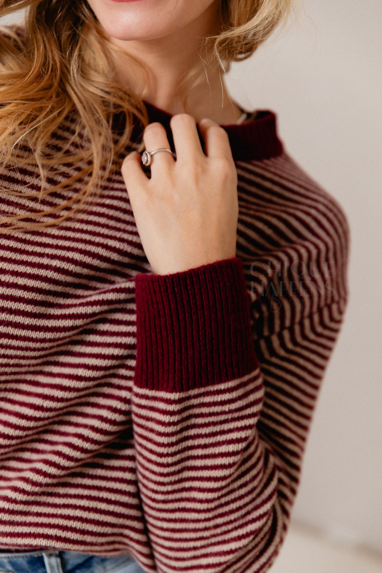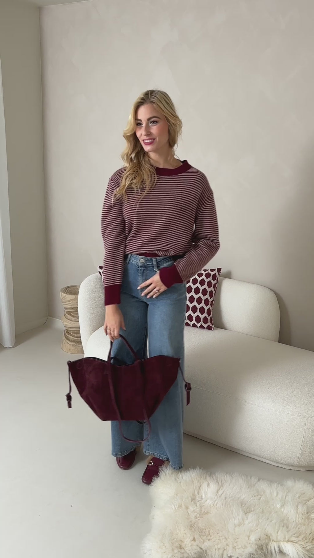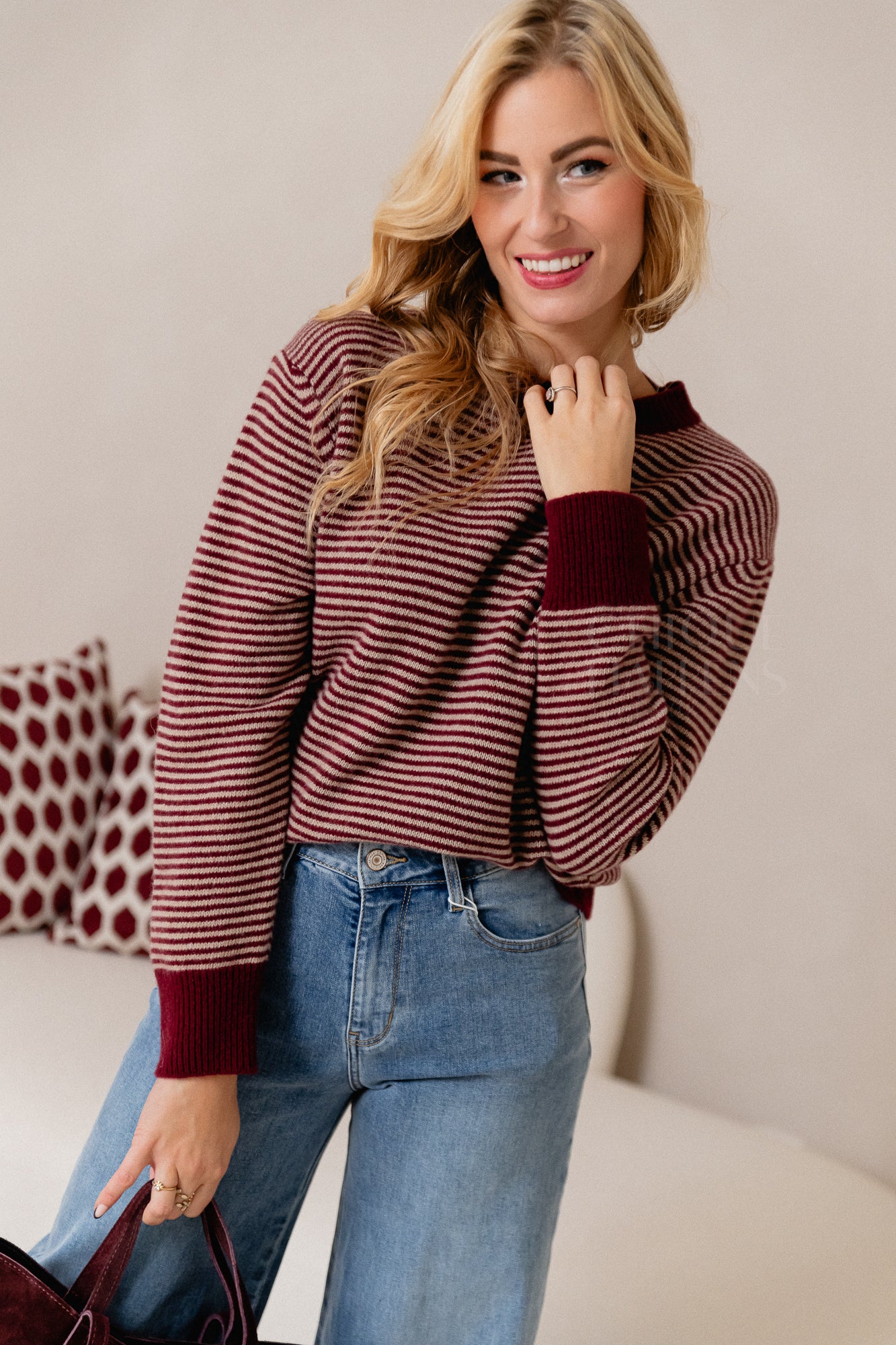 Casual trui met strepen in burgundy en beige. Zacht en comfortabel, perfect voor een stijlvolle, ontspannen look. 👀