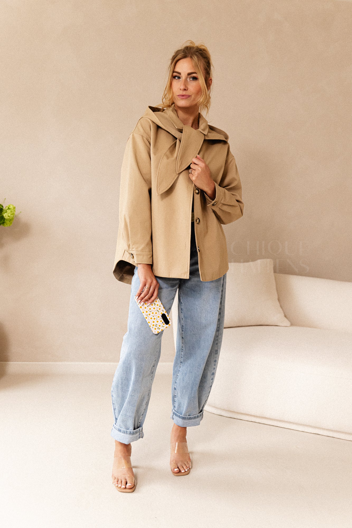 Een beige korte trenchcoat met kap en elegant sjaaldetail, knoopbaar voor een verfijnde look. Achteraan is de jas iets langer, de stof is afgewerkt met een luxueuze, hoogwaardige finish. 🤍✨