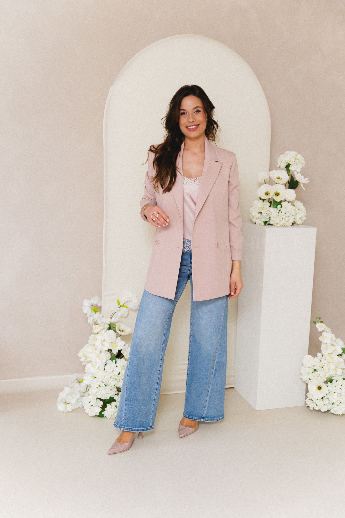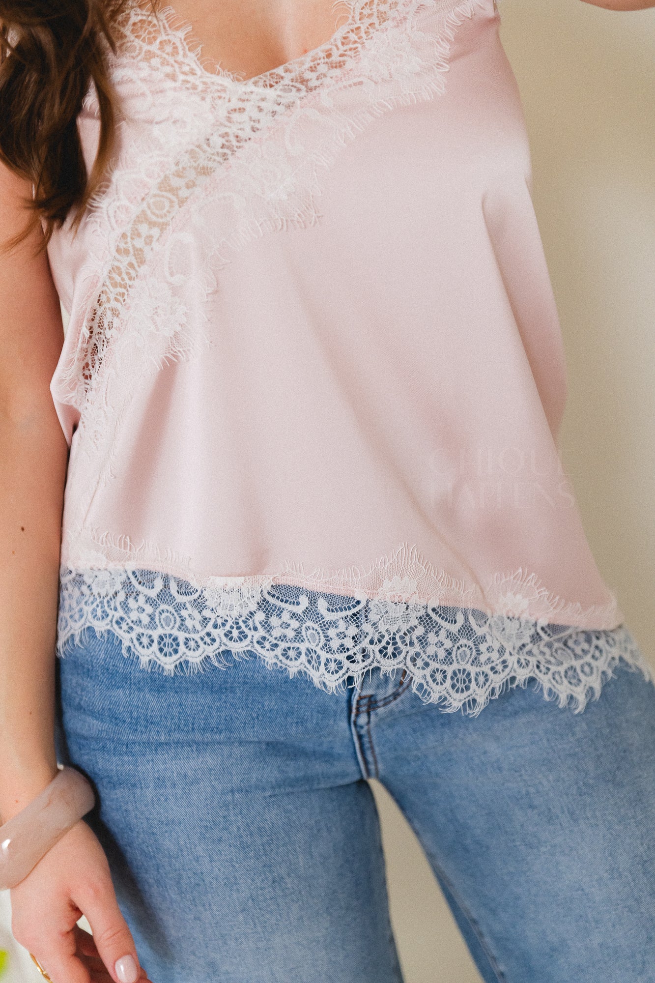 Een satijnen topje in poederroze met mooie kanten details aan de hals en zoom, en een asymmetrische onderkant. Draag de top onder een blazer of combineer met jeans voor een chique, moeiteloze look. 🌸
