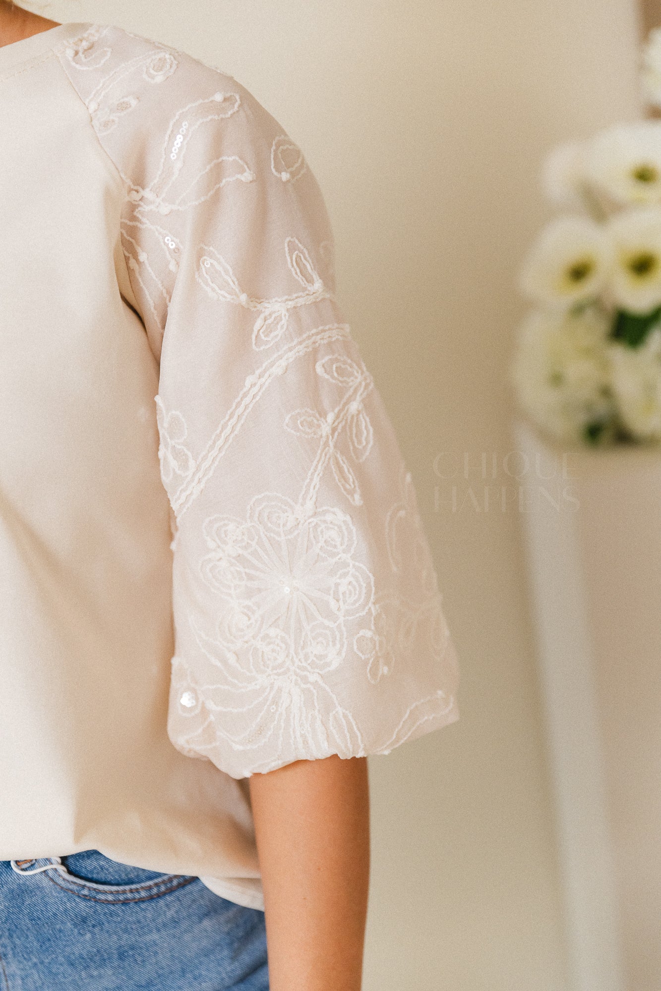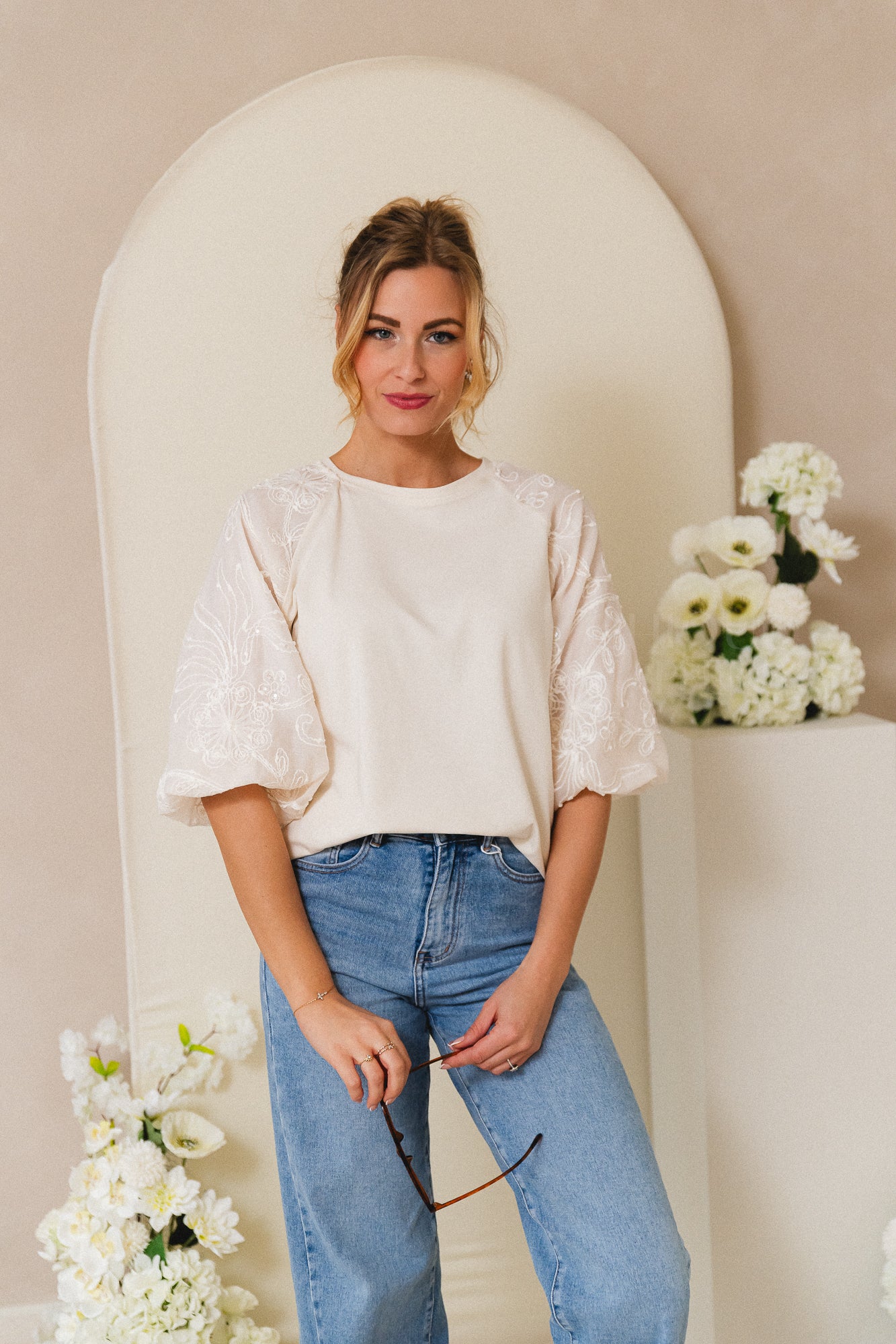 Zachte, stretch top in een warme gebroken witte tint. De top is voorzien van prachtige ballonmouwen met delicate bloemenborduurwerk en subtiele glitterdetails. ✨