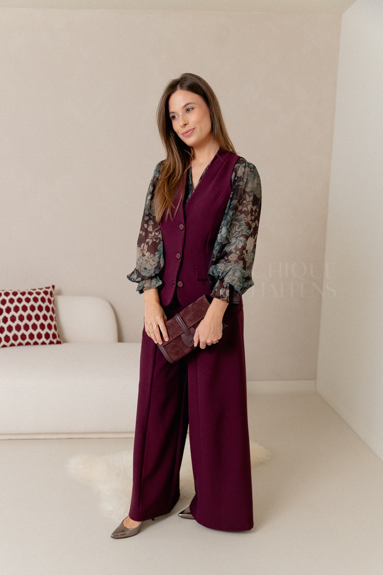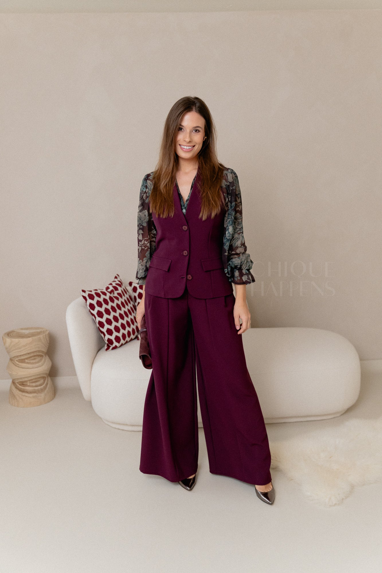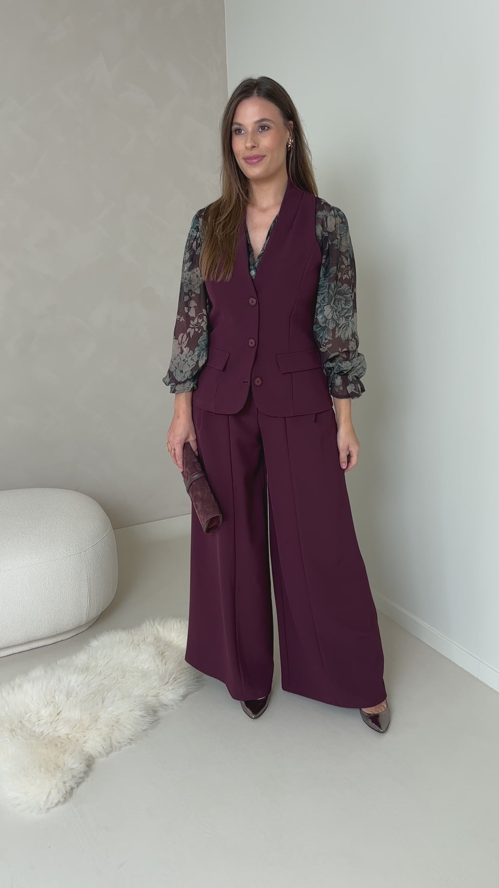 Stijlvolle set van Italiaanse makelij met een wijd uitlopende broek met plooitjes en een bijpassend giletje. De stof voelt superchique aan en heeft een luxe afwerking. Combineer met een blouse of souspulletje voor een moeiteloos geklede look.
