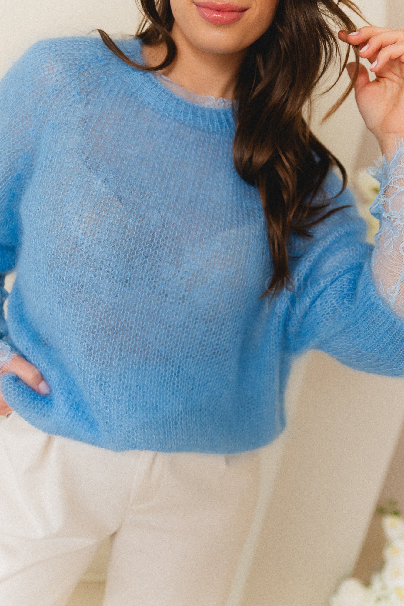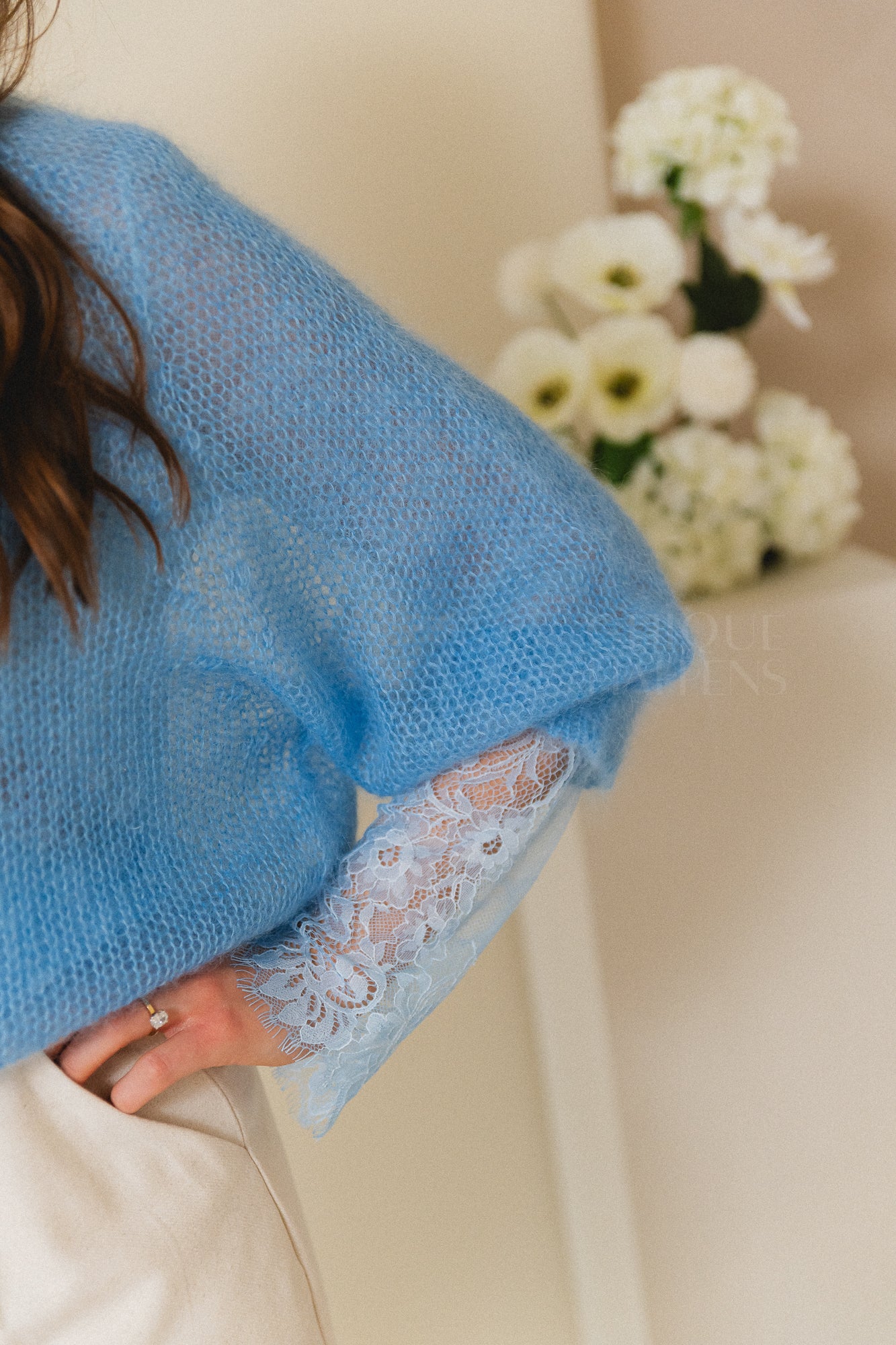 Ultrazachte blauwe knit met korte mouwen in een breder geweven structuur met subtiele openingen. De luchtige steek maakt hem perfect voor de lente: licht, ademend en toch cosy. Afgewerkt in een prachtige, hoogwaardige kwaliteit die zacht aanvoelt en mooi in vorm blijft. Ideaal om casual te dragen op een jeans of over een blouse.