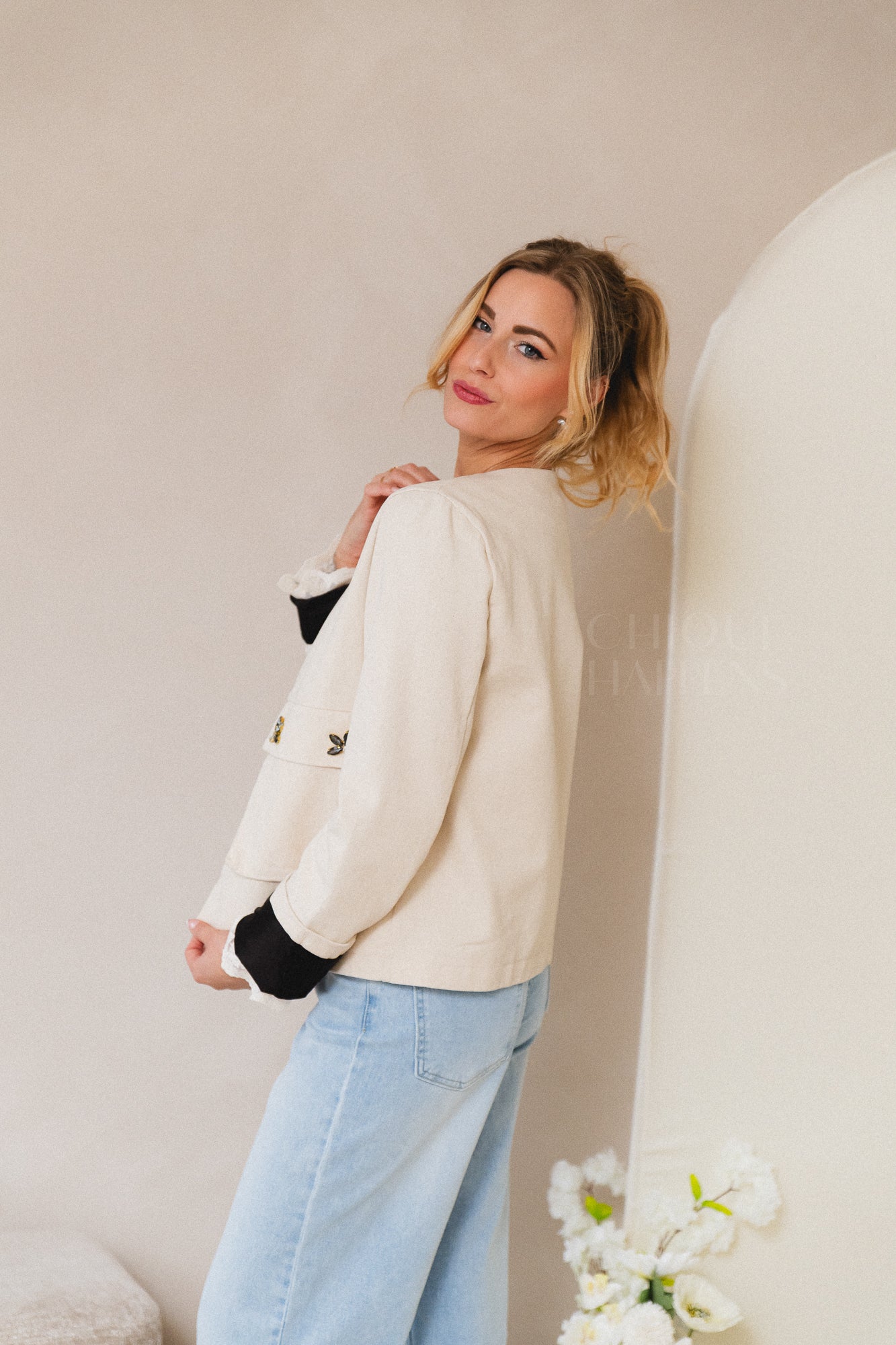 Luchtig vestje van hoogwaardig linnen-look materiaal (100% katoen!) met een mooie binnenvoering. De omgeslagen mouwen met contrasterende bies geven het een speelse twist. Afgewerkt met een mooie diamond flower touch— klaar om elke dag te dragen!