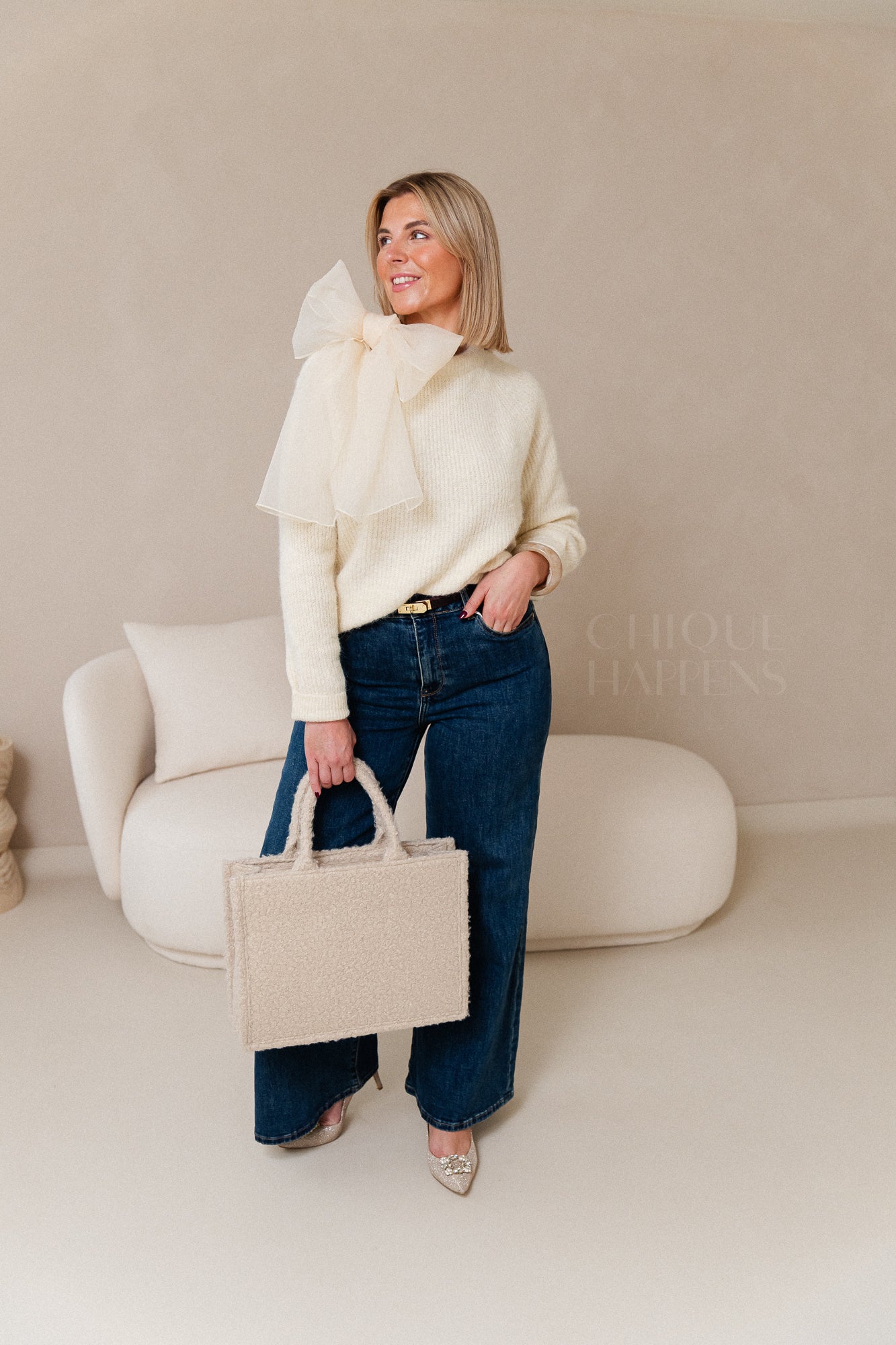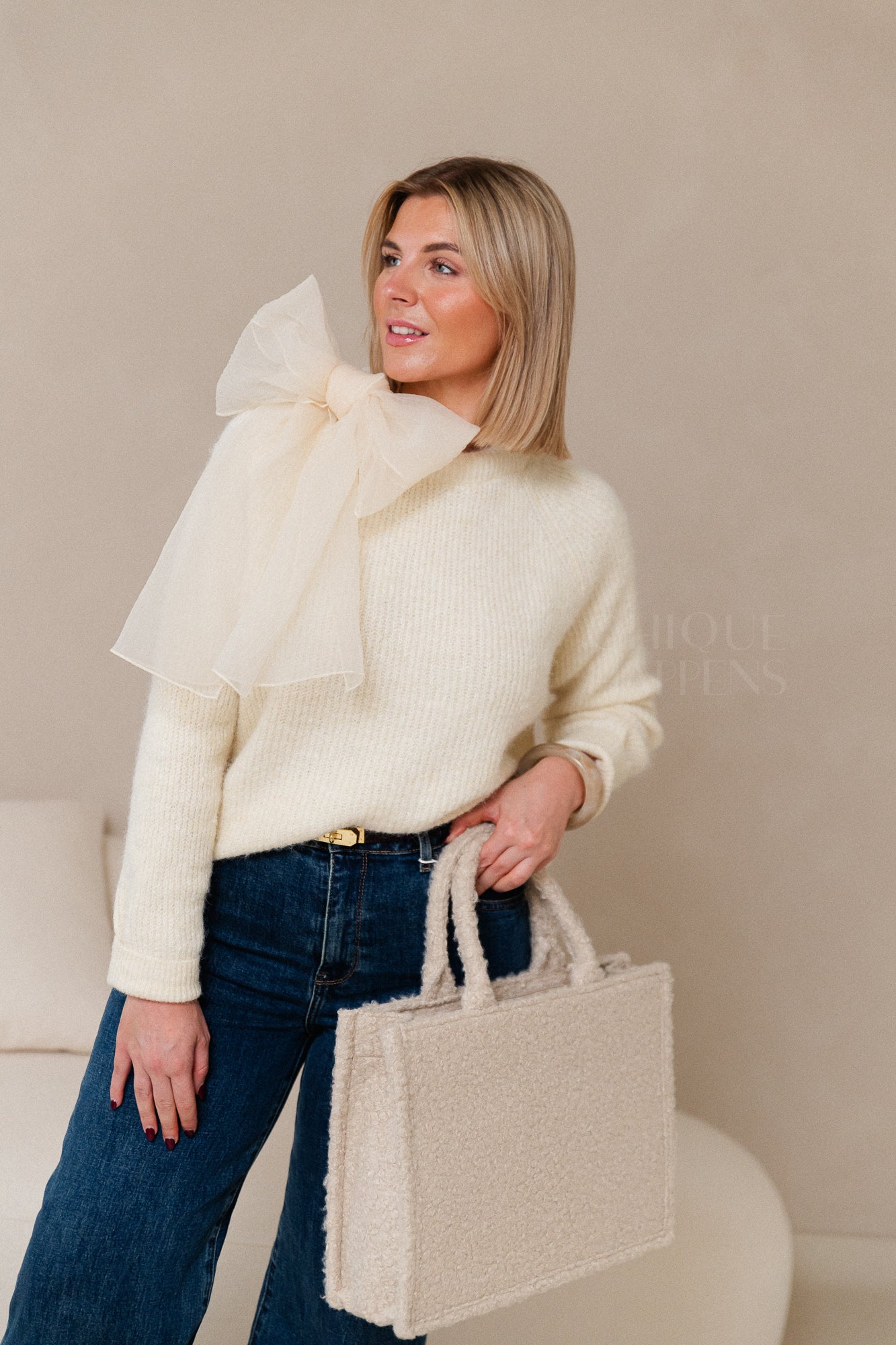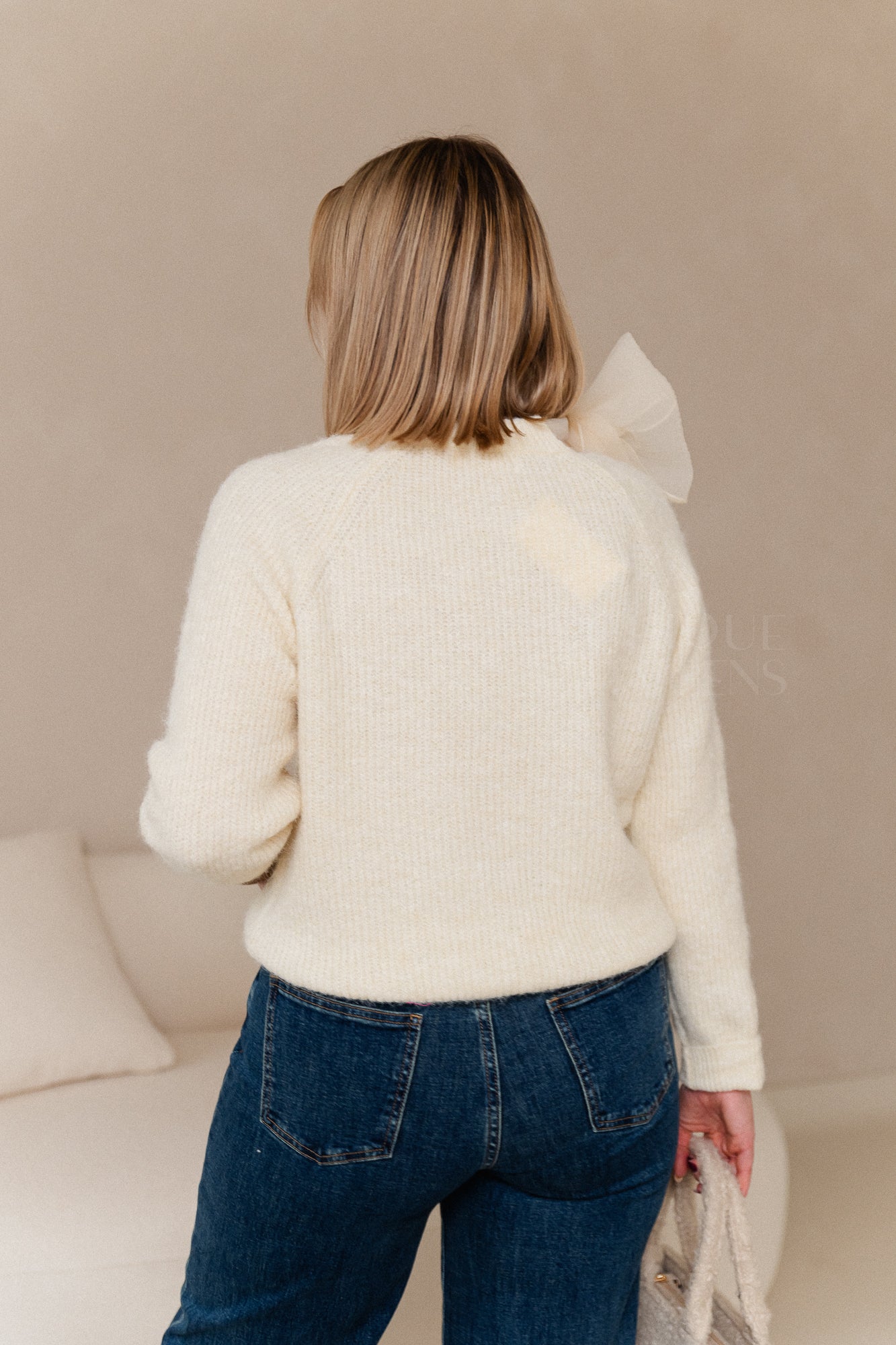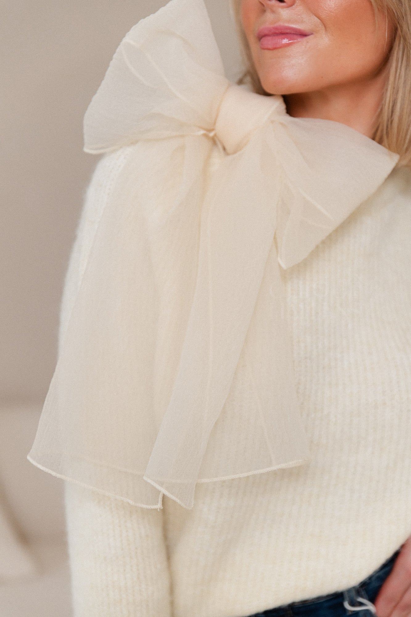 Zachte trui met een elegante voile strik. Luxueus en stijlvol, perfect om je outfit een vrouwelijke touch te geven!