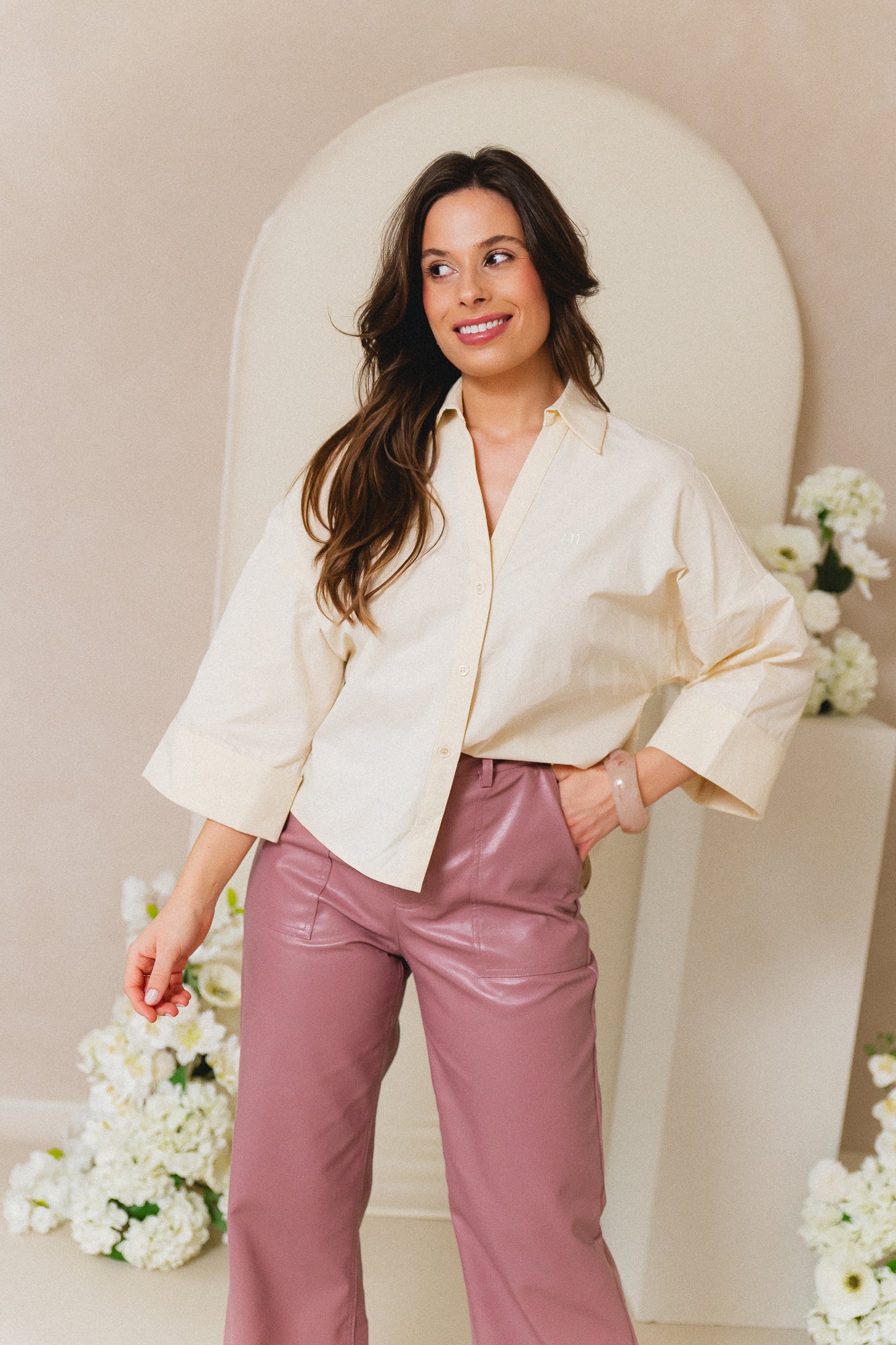 Een ecru blouse uit 100% katoen met klassieke kraag en 3/4 wijde mouwen. De oversized pasvorm geeft een relaxte look en valt los om het lichaam.