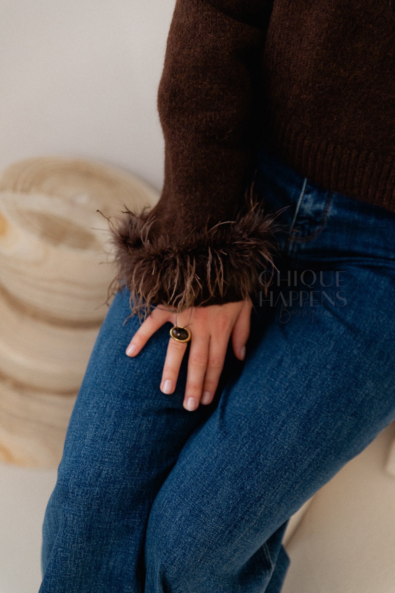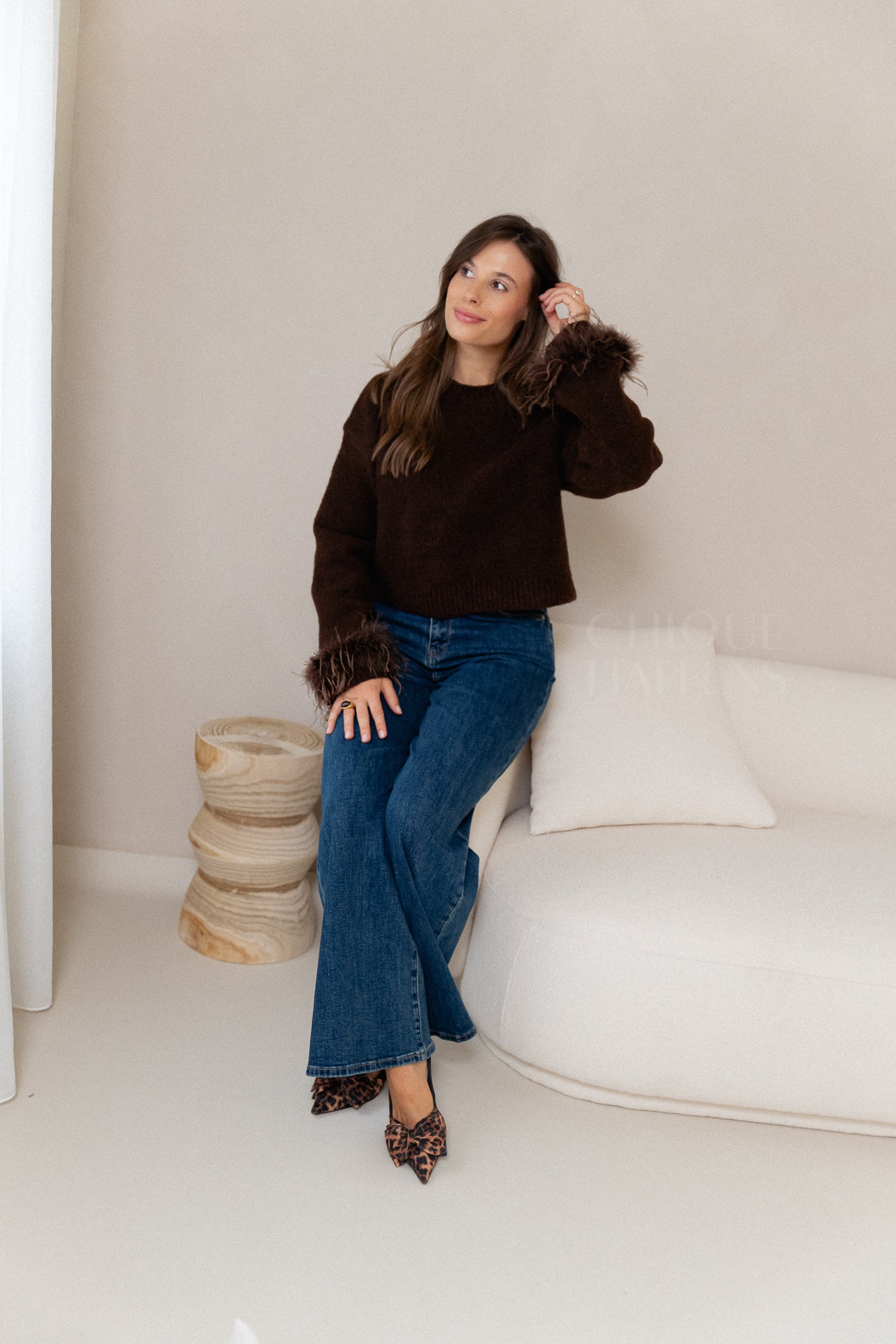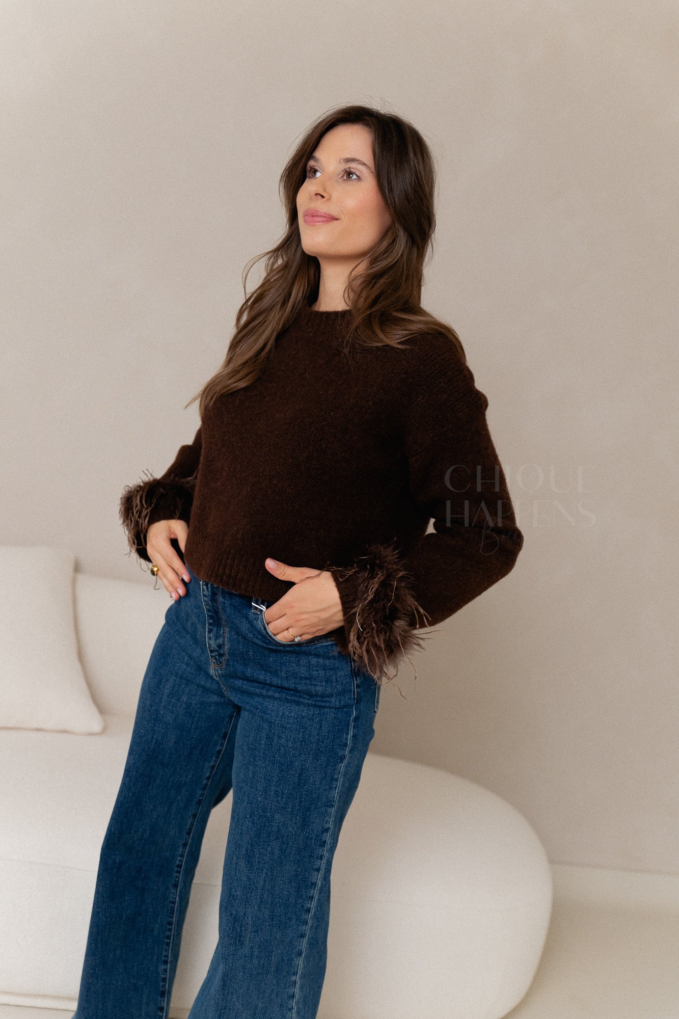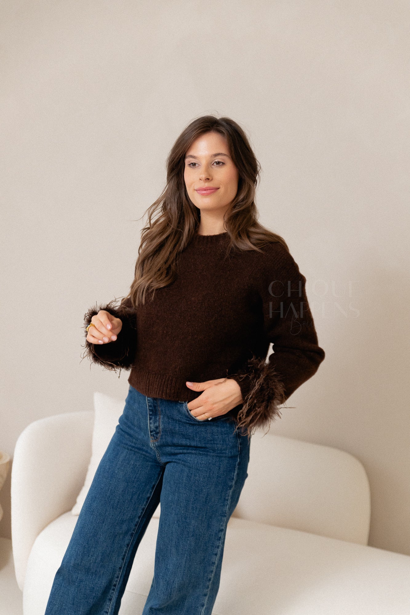 Korte knit in een rijke bruine kleur met speelse veertjesdetails op de mouwen. Comfortabel en stijlvol, met een verfijnde touch die je look extra karakter geeft.