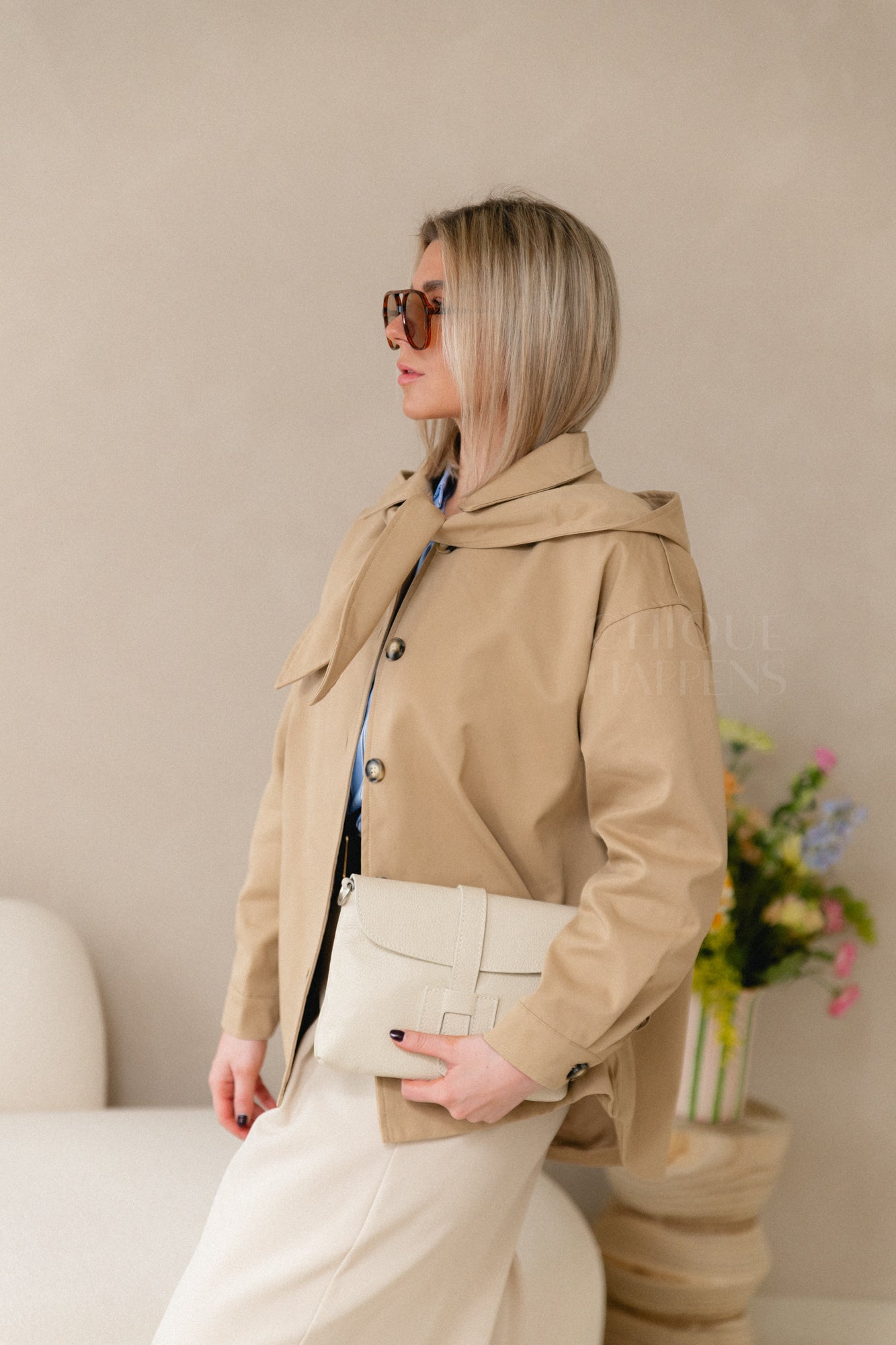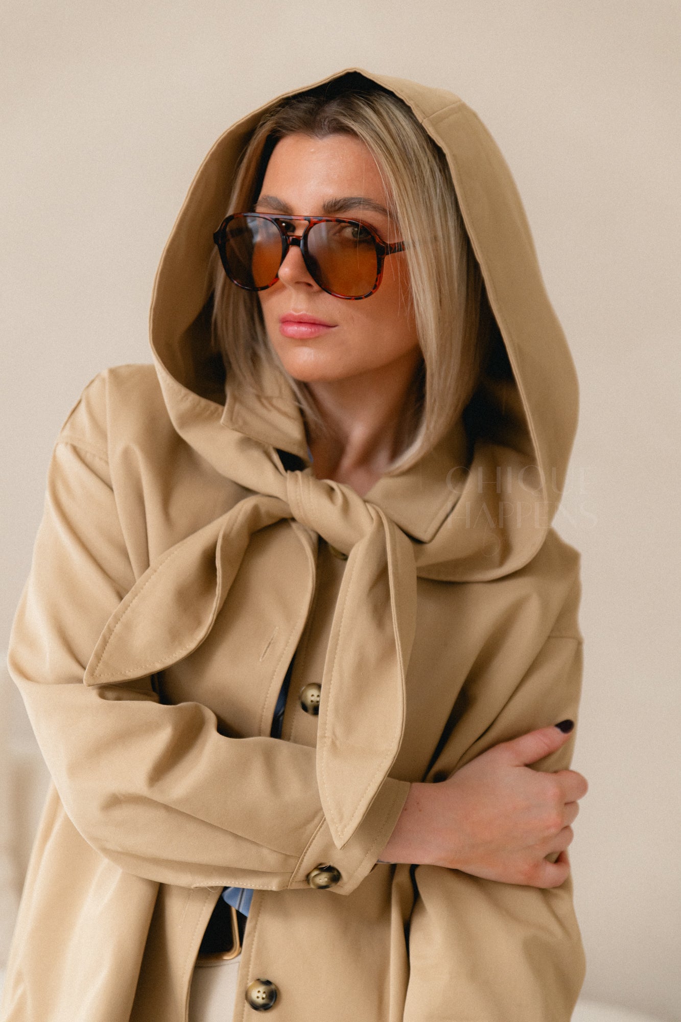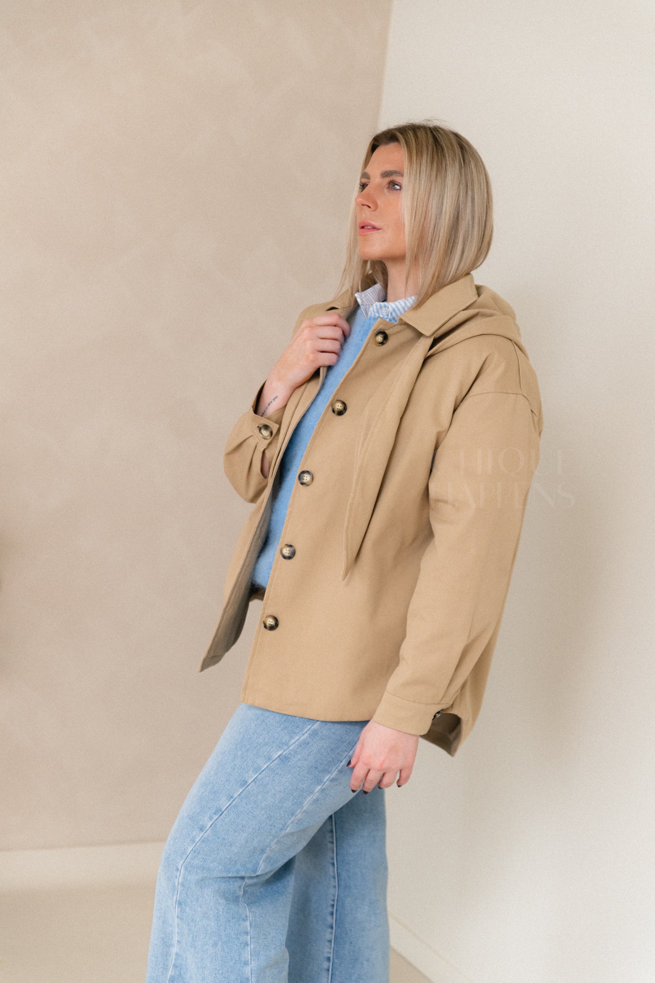 Een beige korte trenchcoat met kap en elegant sjaaldetail, knoopbaar voor een verfijnde look. Achteraan is de jas iets langer, de stof is afgewerkt met een luxueuze, hoogwaardige finish. 🤍✨
