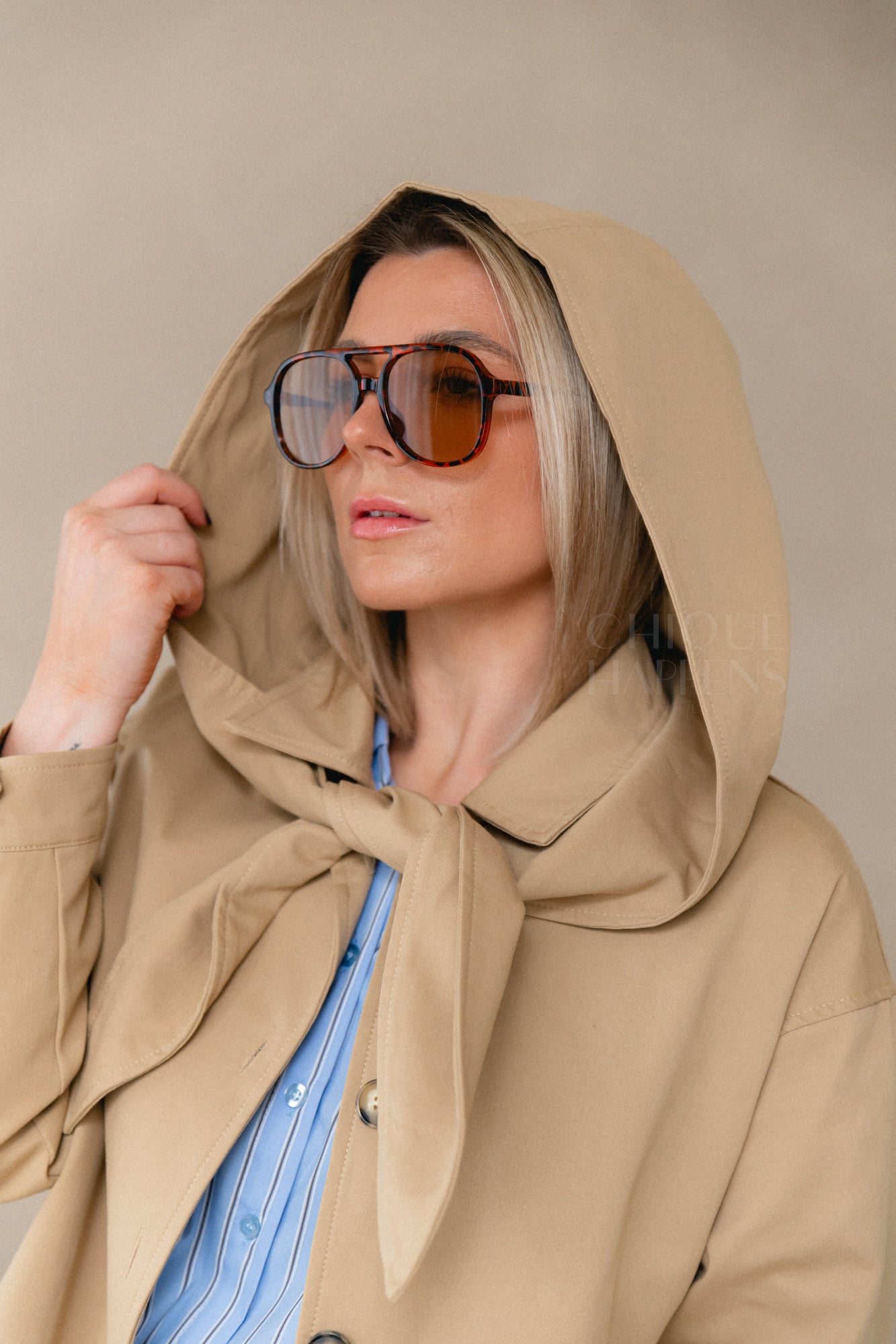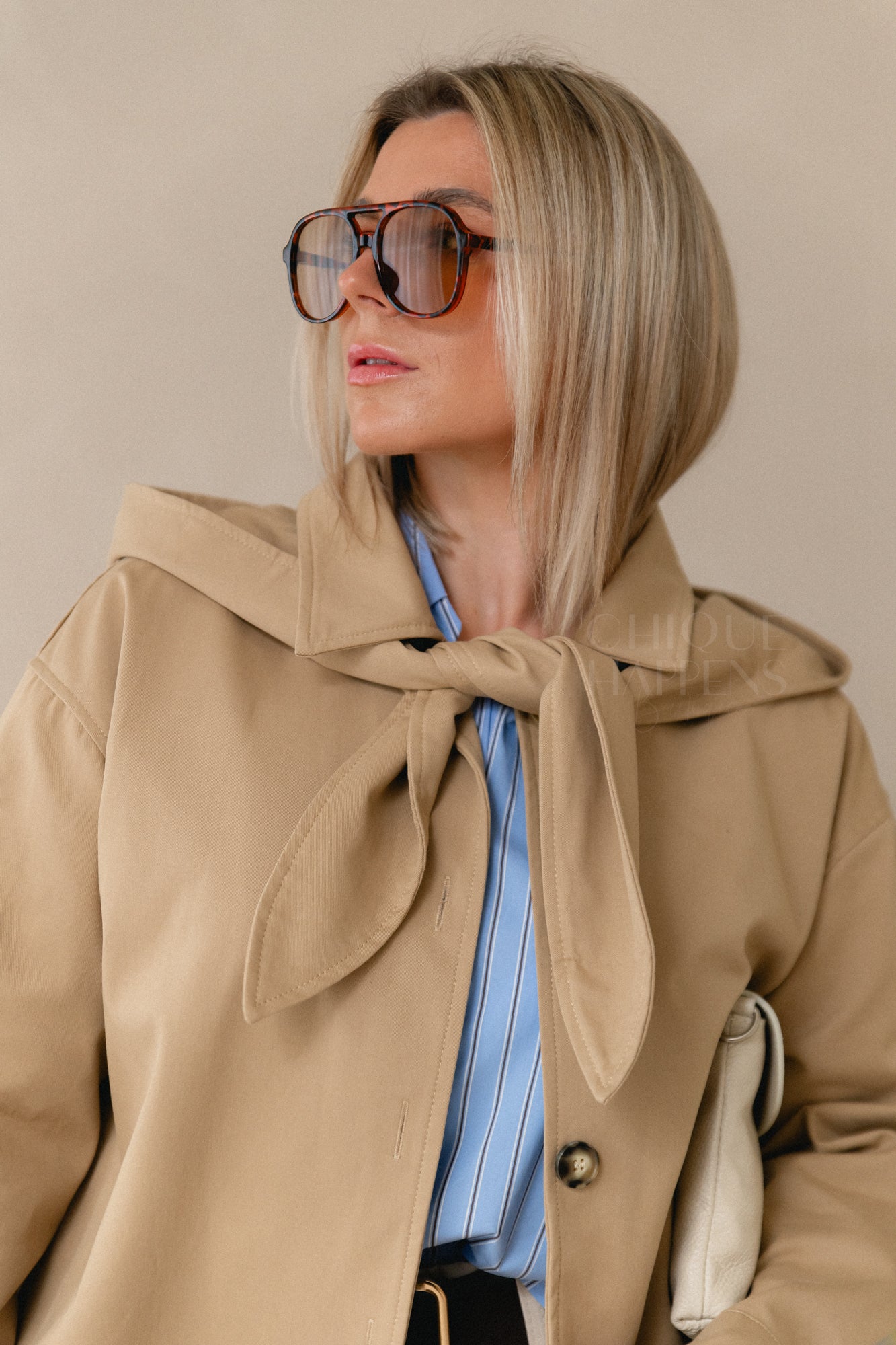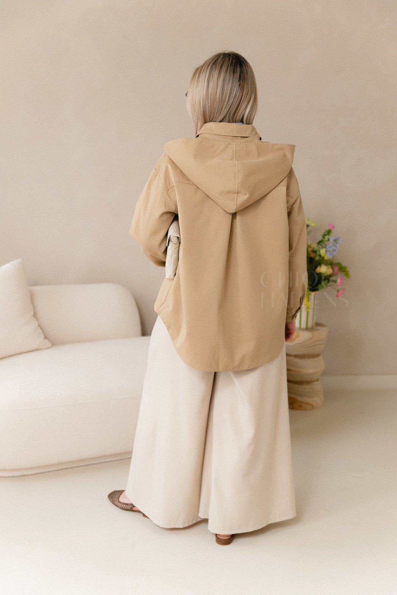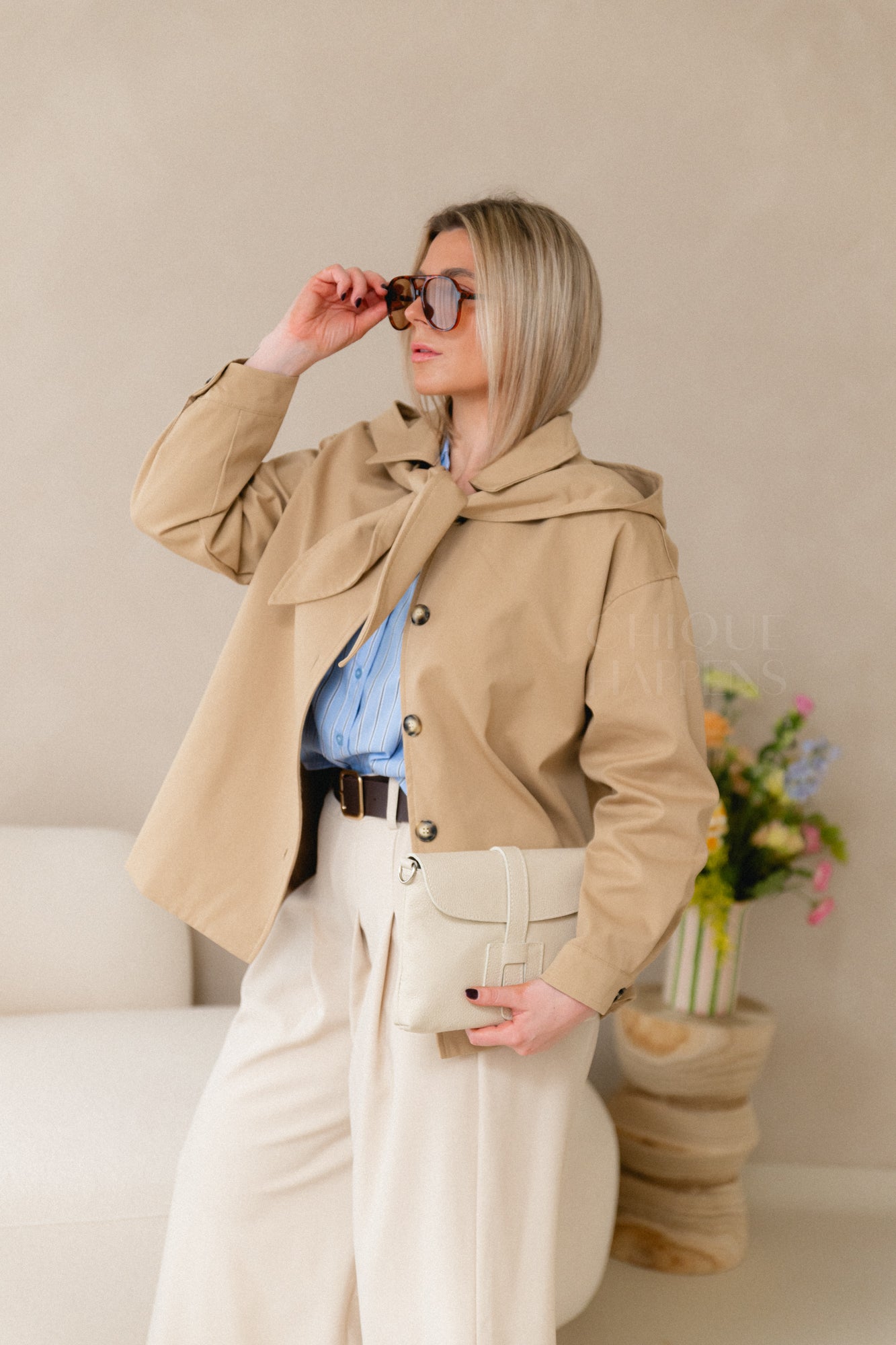 Een beige korte trenchcoat met kap en elegant sjaaldetail, knoopbaar voor een verfijnde look. Achteraan is de jas iets langer, de stof is afgewerkt met een luxueuze, hoogwaardige finish. 🤍✨