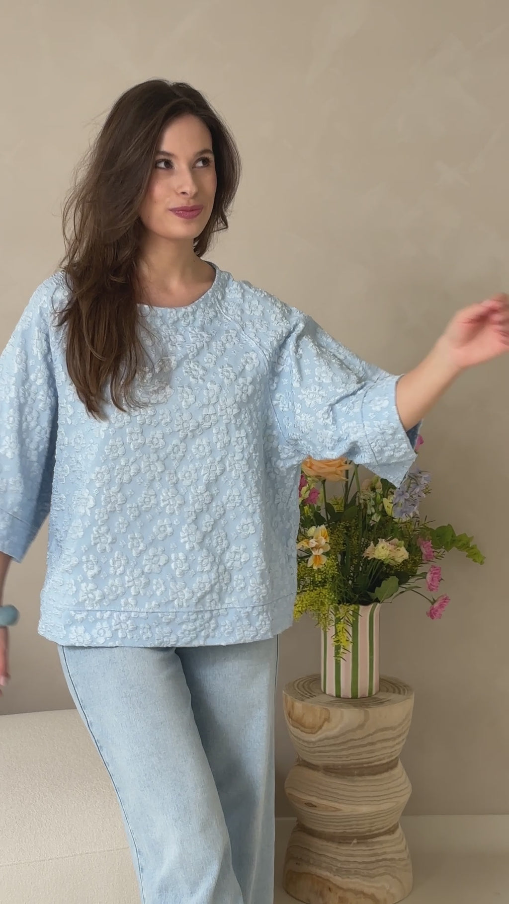 Stijlvol rokje in een exclusieve reliefstof met bloemen in pastelkleurtjes. De luxe textuur en zachte tinten zorgen voor een elegante, verfijnde look.