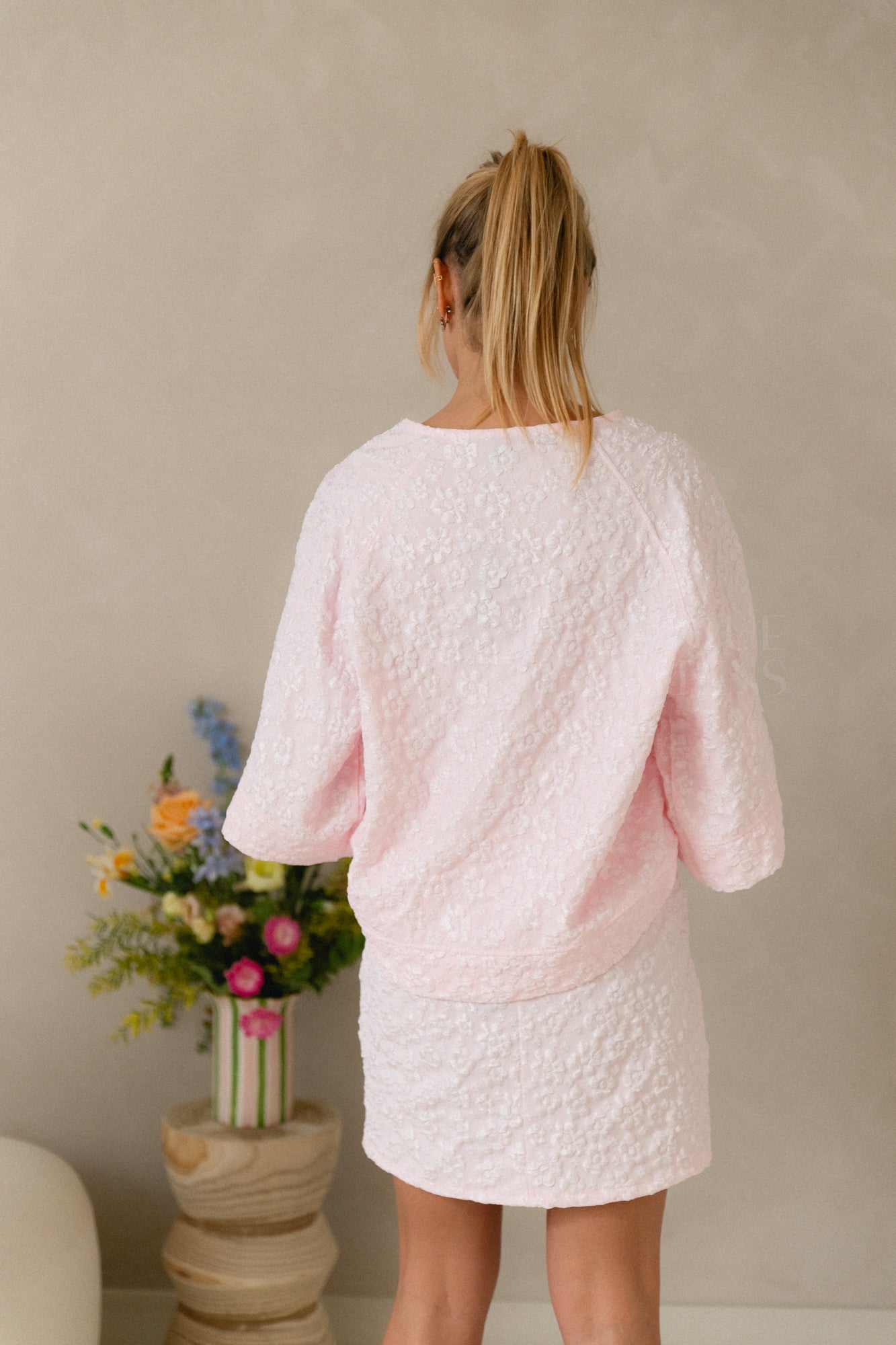 Stijlvolle blouse in een exclusieve reliefstof met bloemen in pastelkleurtjes. De luxe textuur en zachte tinten zorgen voor een elegante, verfijnde look.