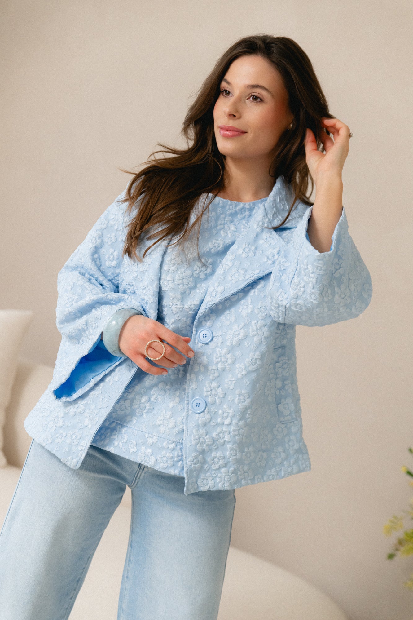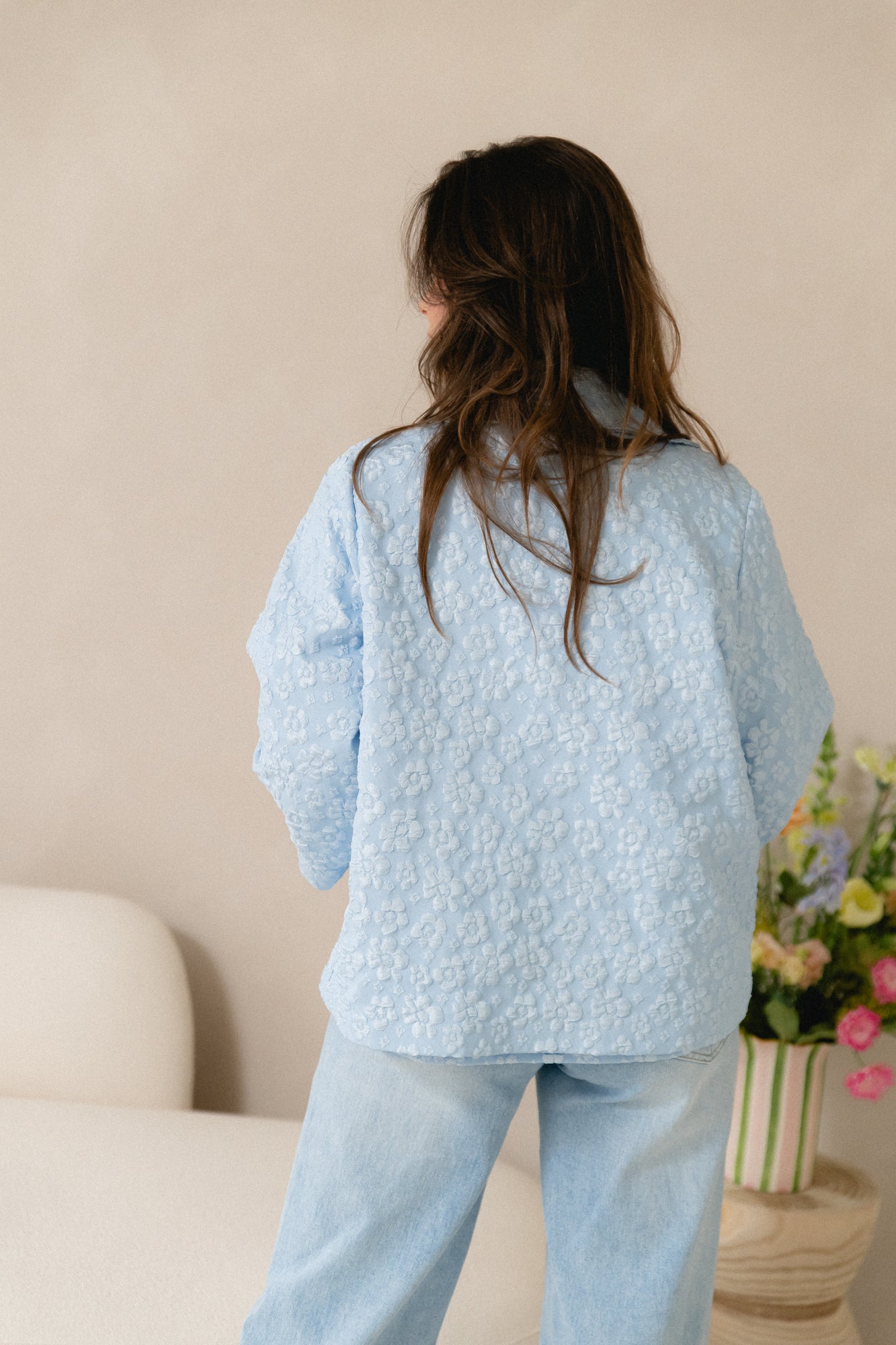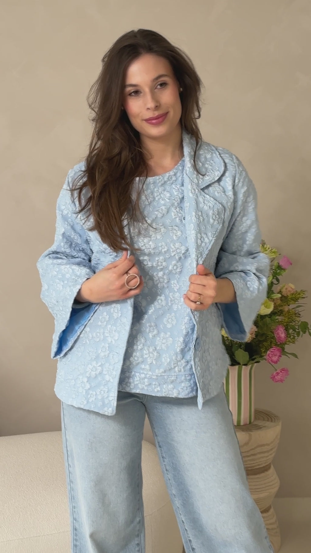 Stijlvol vestje in een exclusieve reliefstof met bloemen in pastelkleurtjes. De luxe textuur en zachte tinten zorgen voor een elegante, verfijnde look.