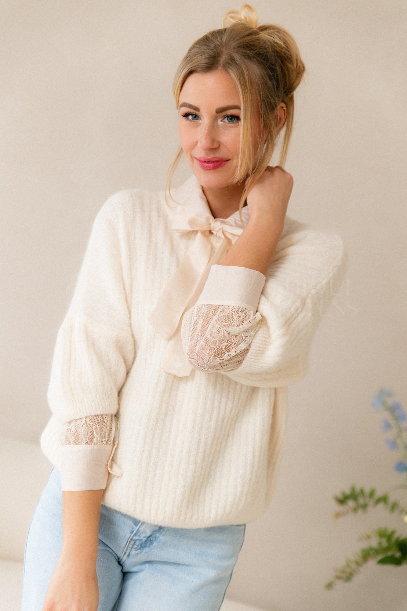 Een hemdsblouse volledig in kant met een elegante strik aan de hals voor een verfijnde, vrouwelijke uitstraling. Een echte eyecatcher met een speelse touch. ✨