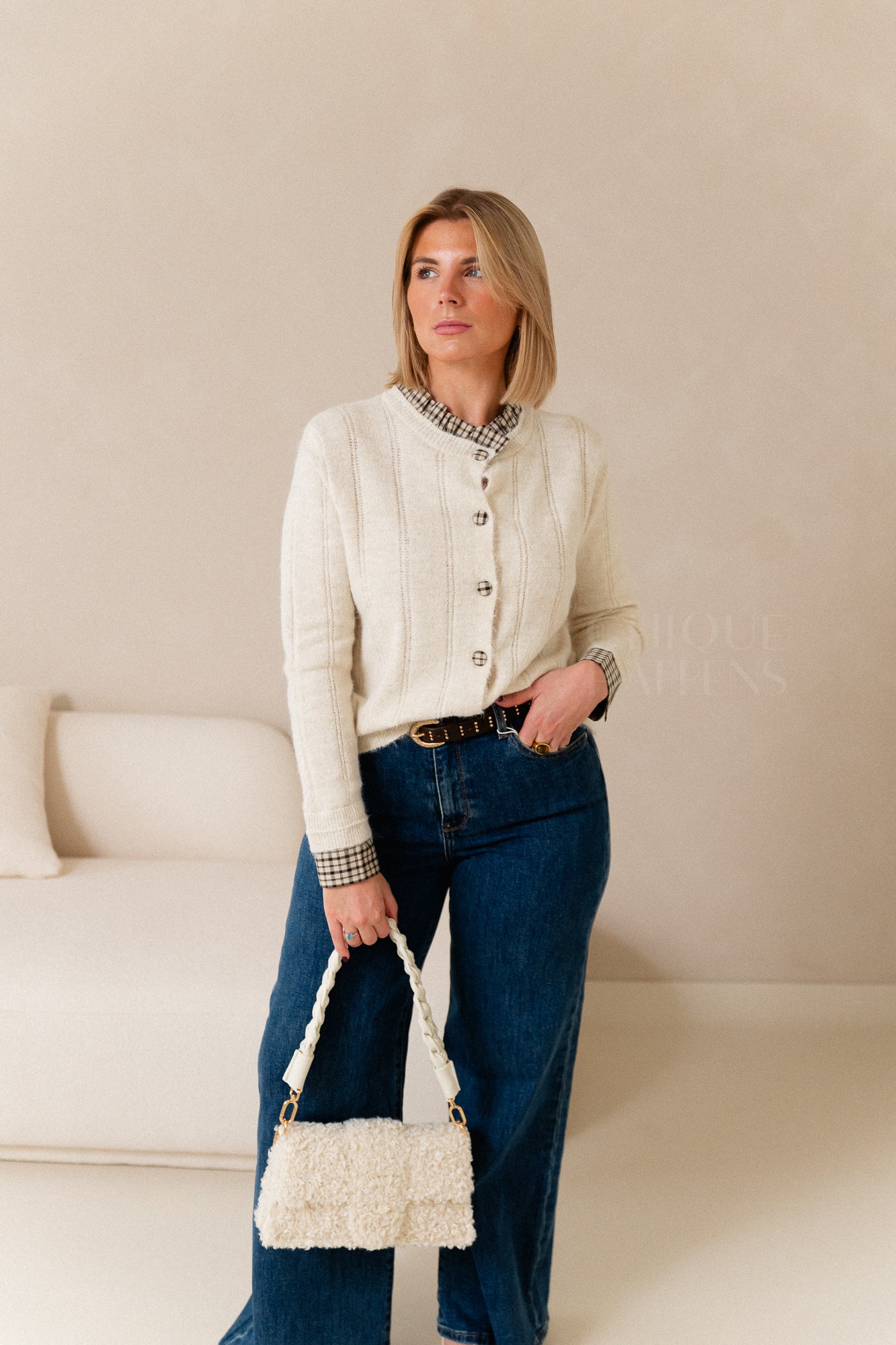 Ecru truitje met ingebouwd geruit hemdje en bijpassende knoopjes vooraan. Chique en speels, ideaal te combineren met een rokje of jeans voor een stijlvolle look.
