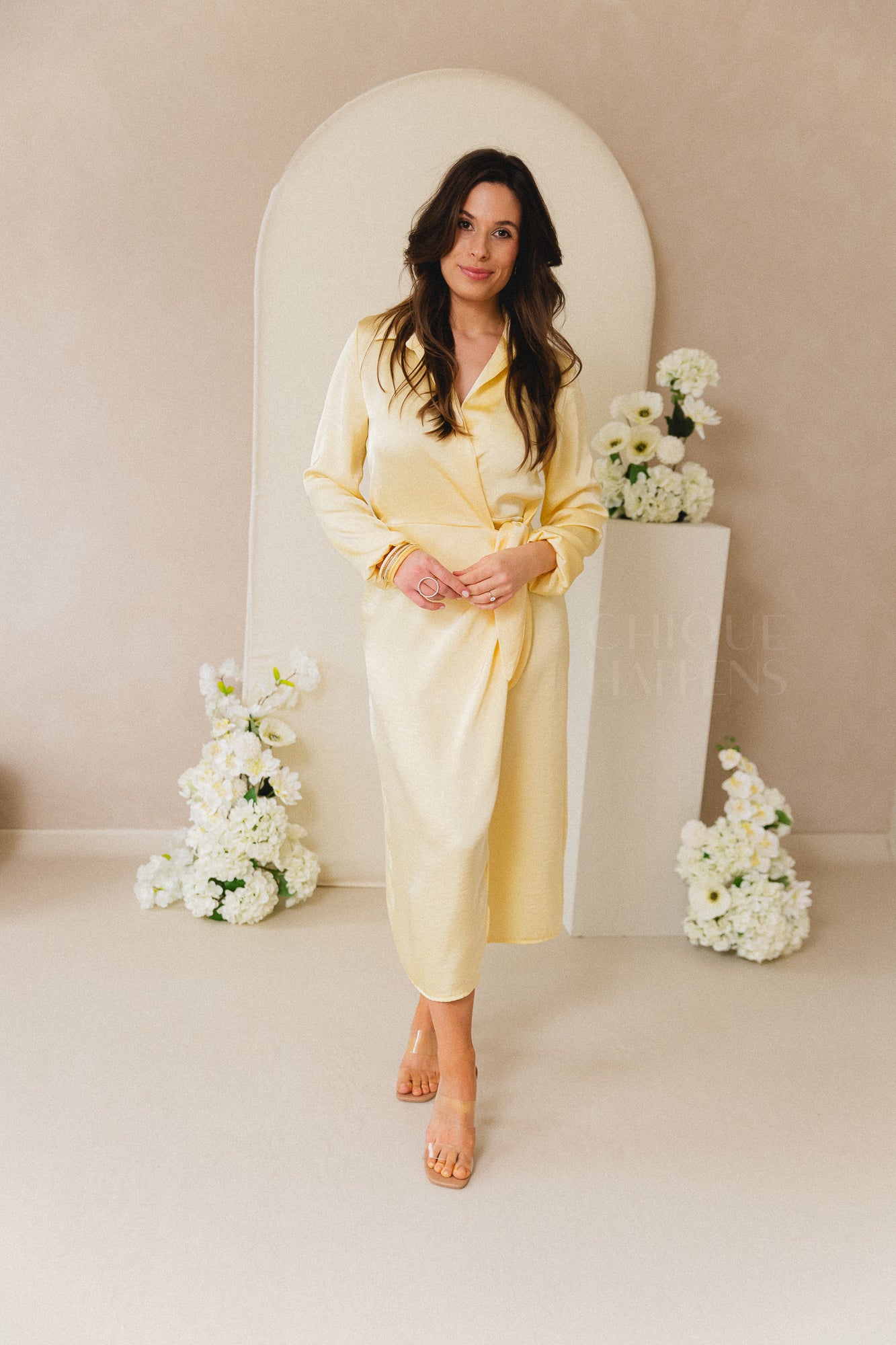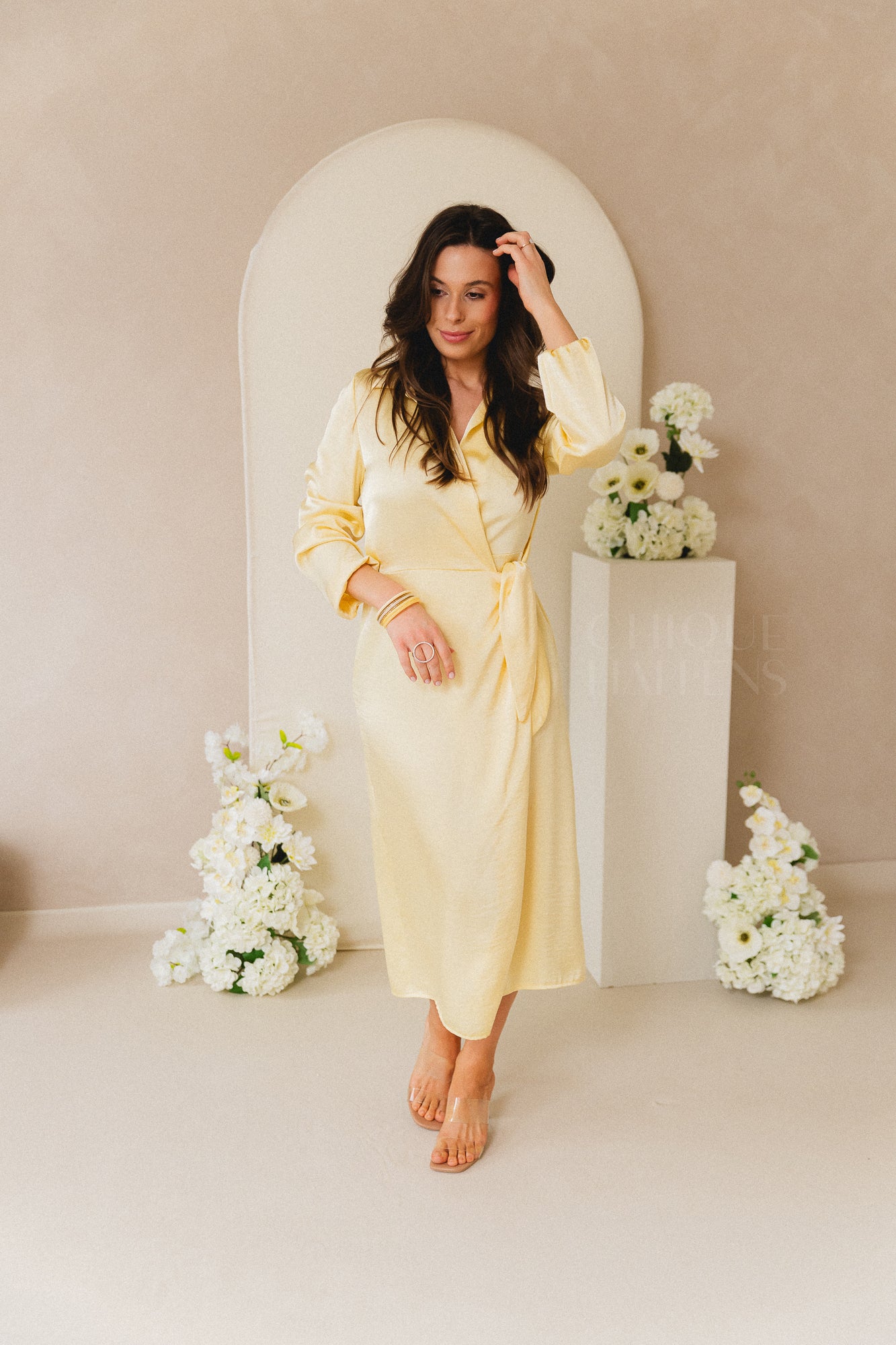 Een elegante midi-jurk in zachtroze satijnlookstof met een verfijnde wikkelstijl en hemdkraag. De jurk heeft lange mouwen en een strikdetail aan de zijkant voor een vrouwelijke, getailleerde look. Ideaal voor speciale gelegenheden, van bruiloften tot communiefeesten.