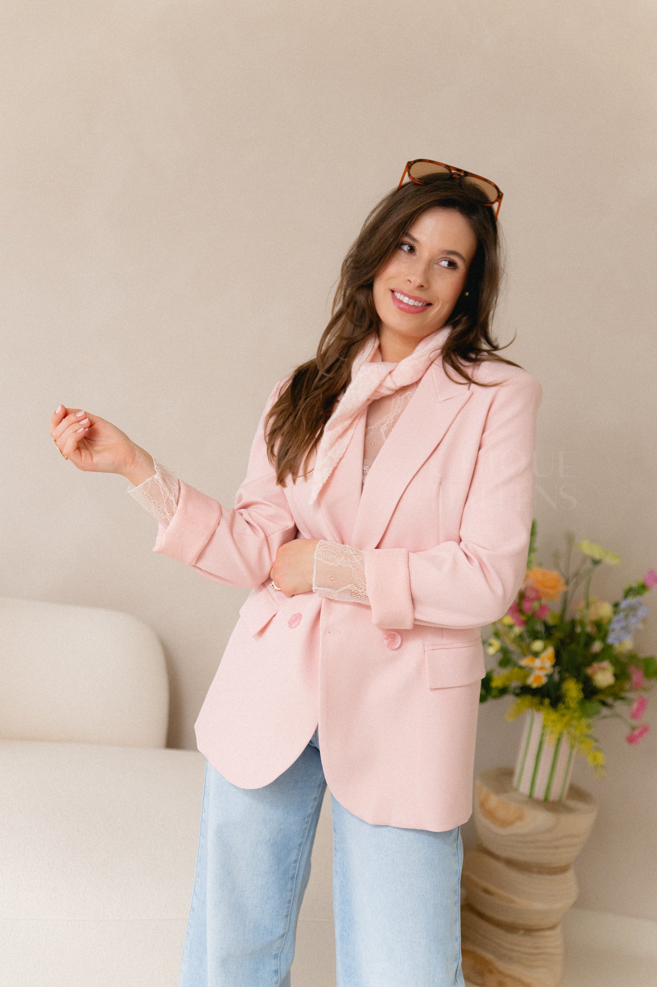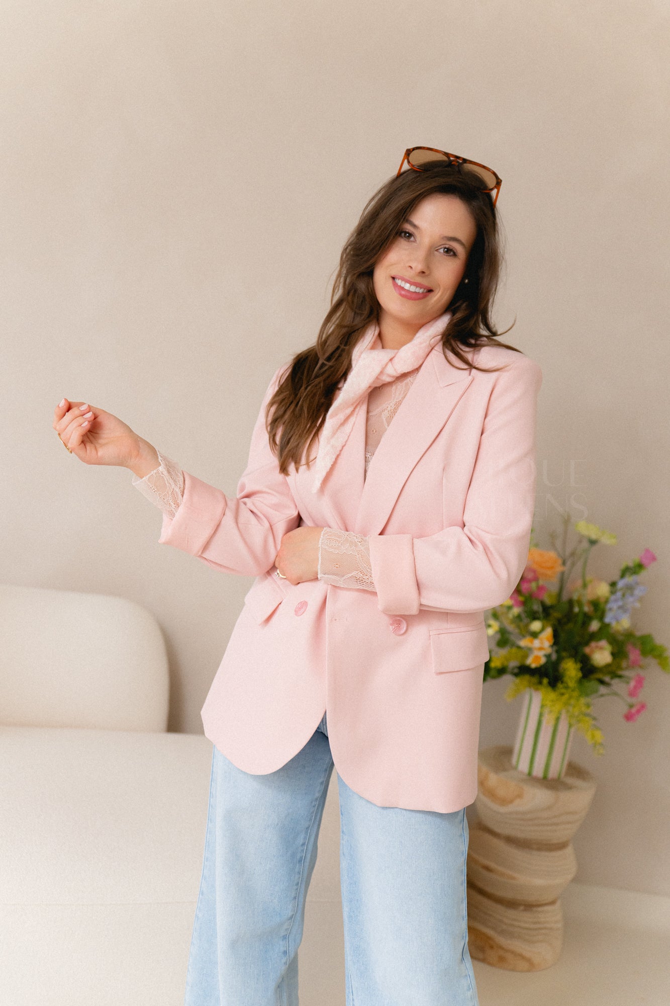 Een lichtroze blazer met een subtiel oversized fit voor een moeiteloos stijlvolle look. Perfect te combineren met een kanten top voor een zachte, vrouwelijke touch. ✨