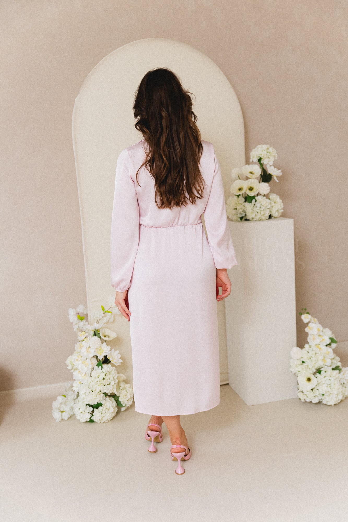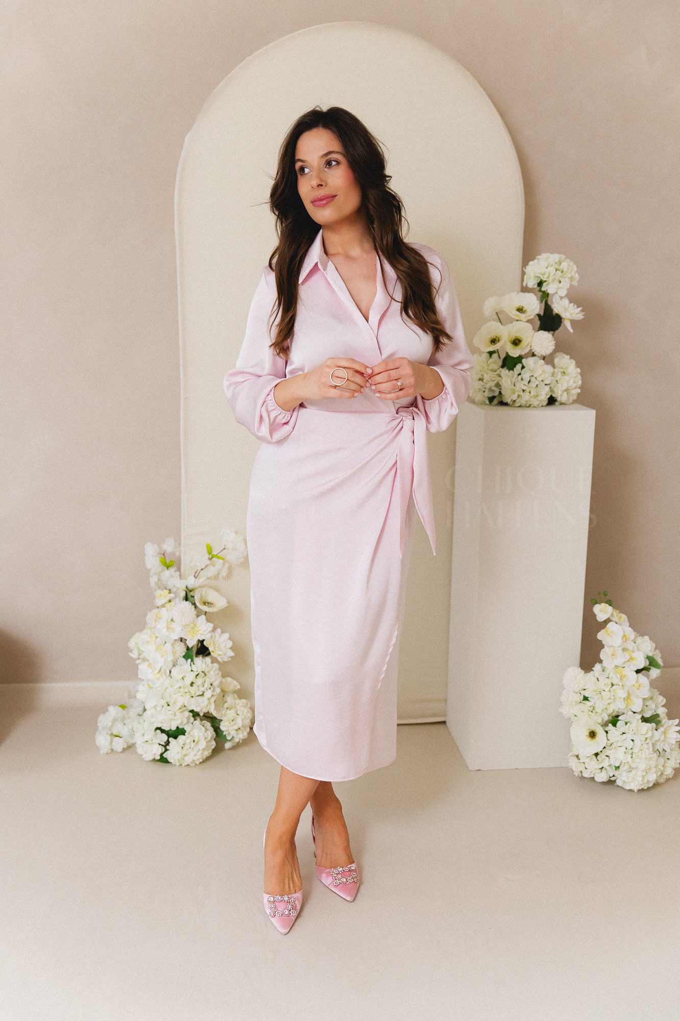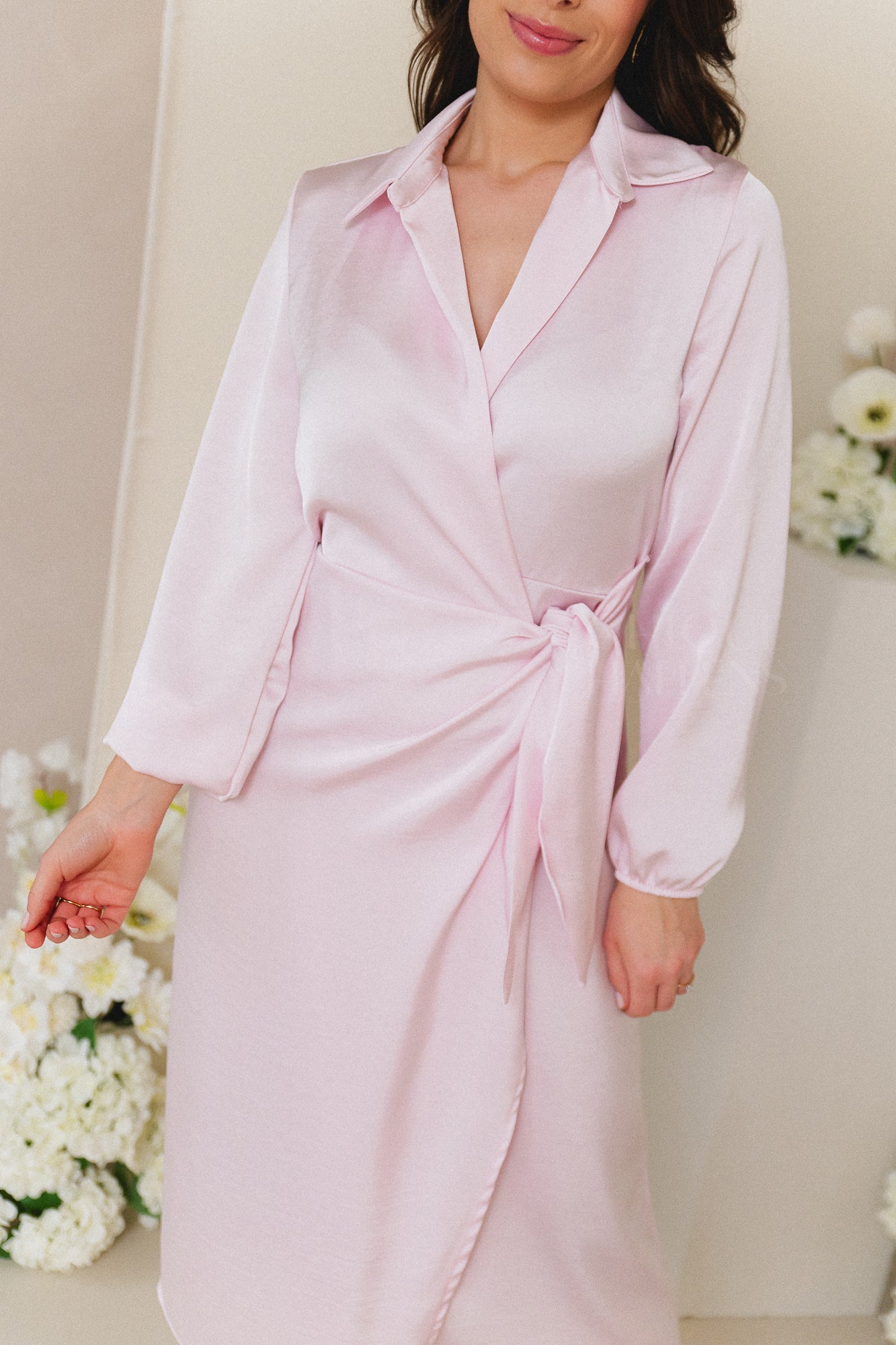 Een elegante midi-jurk in zachtroze satijnlookstof met een verfijnde wikkelstijl en hemdkraag. De jurk heeft lange mouwen en een strikdetail aan de zijkant voor een vrouwelijke, getailleerde look. Ideaal voor speciale gelegenheden, van bruiloften tot communiefeesten.