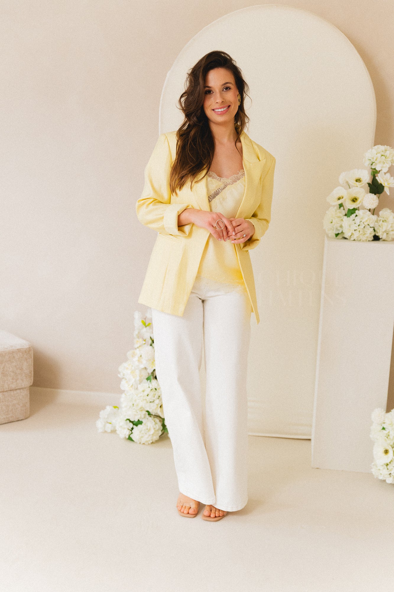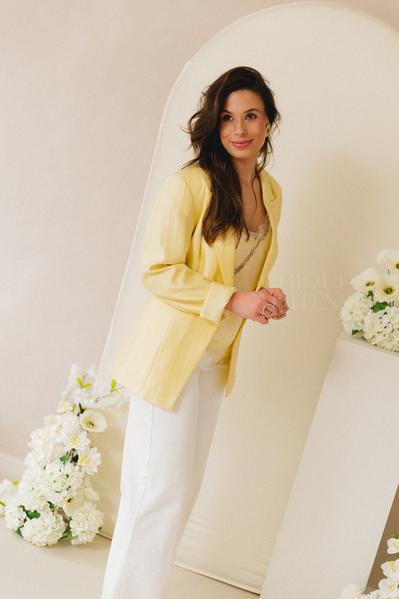 Luchtige blazer in zachte citroengele tint, uitgevoerd in een lichtgewicht glanzende stof. Ruimvallend model met brede revers, één knoopsluiting en een riem met gespen aan de achterzijde voor een getailleerde look. Afgewerkt met omgeslagen mouwen.
