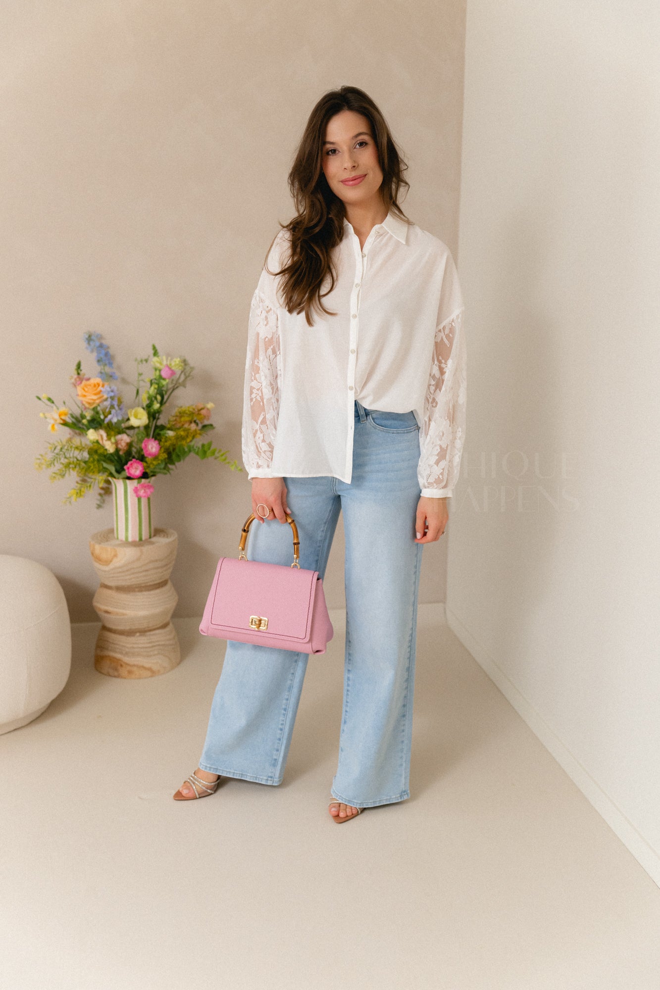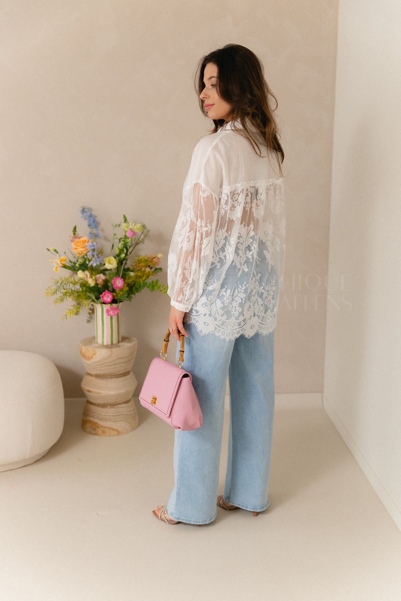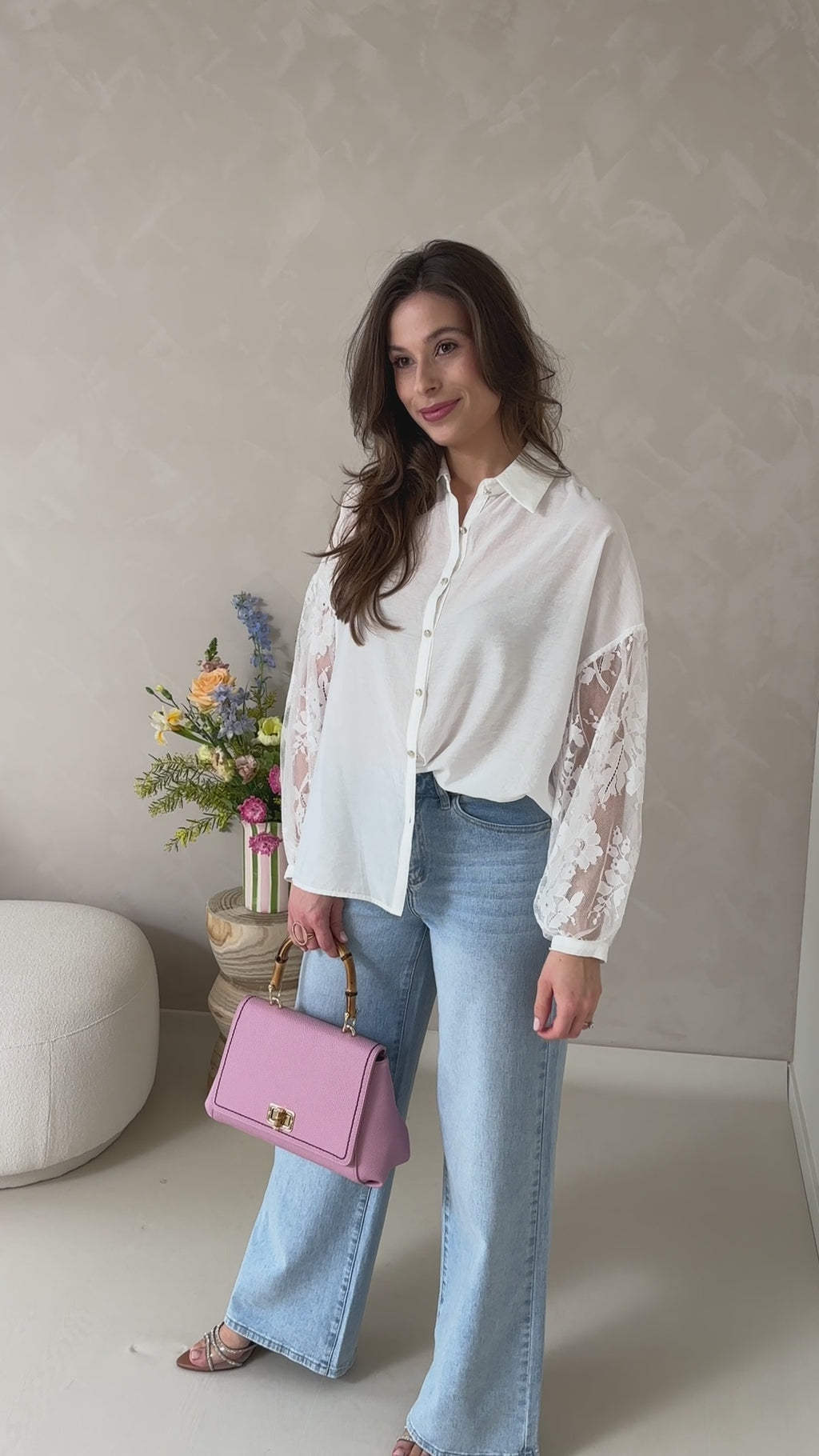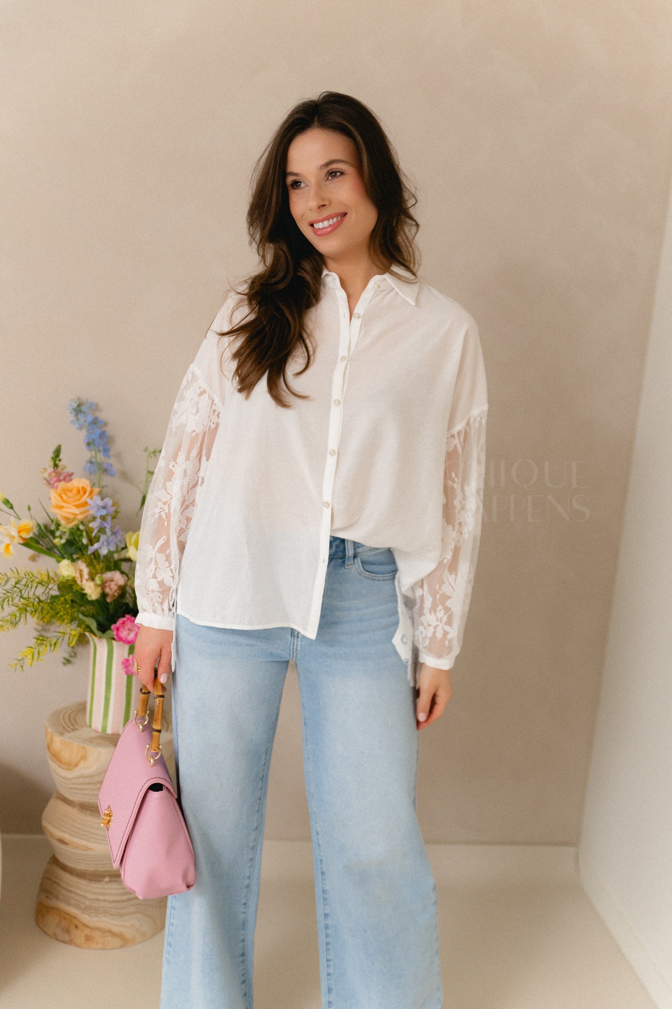 Elegante hemdsblouse met witte voorkant en verfijnde strass knoopjes. De rug en mouwen in volledig kant zorgen voor een vrouwelijke, luxe touch.