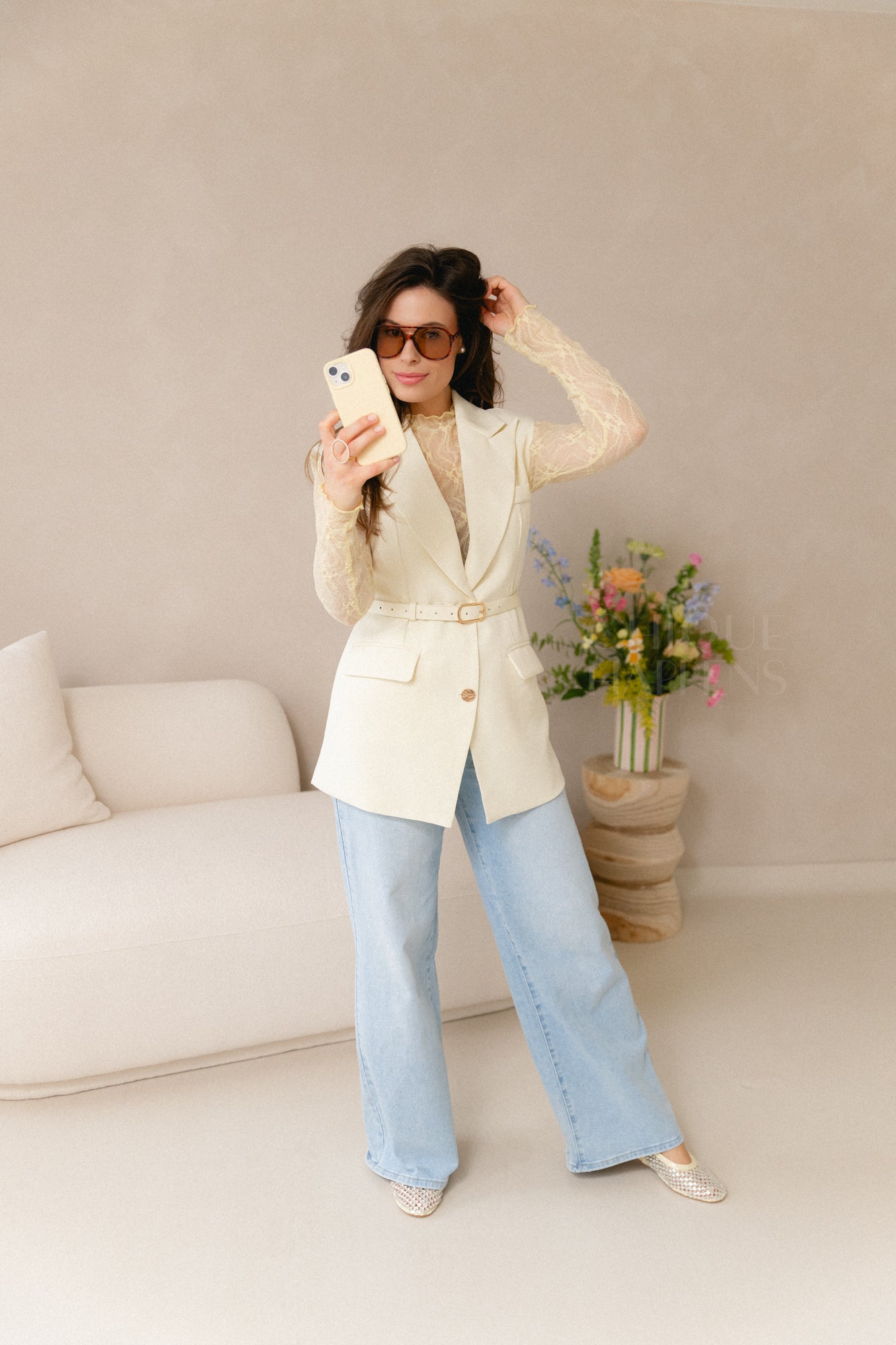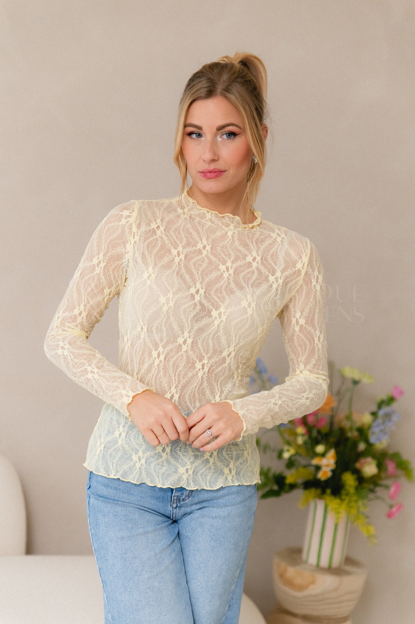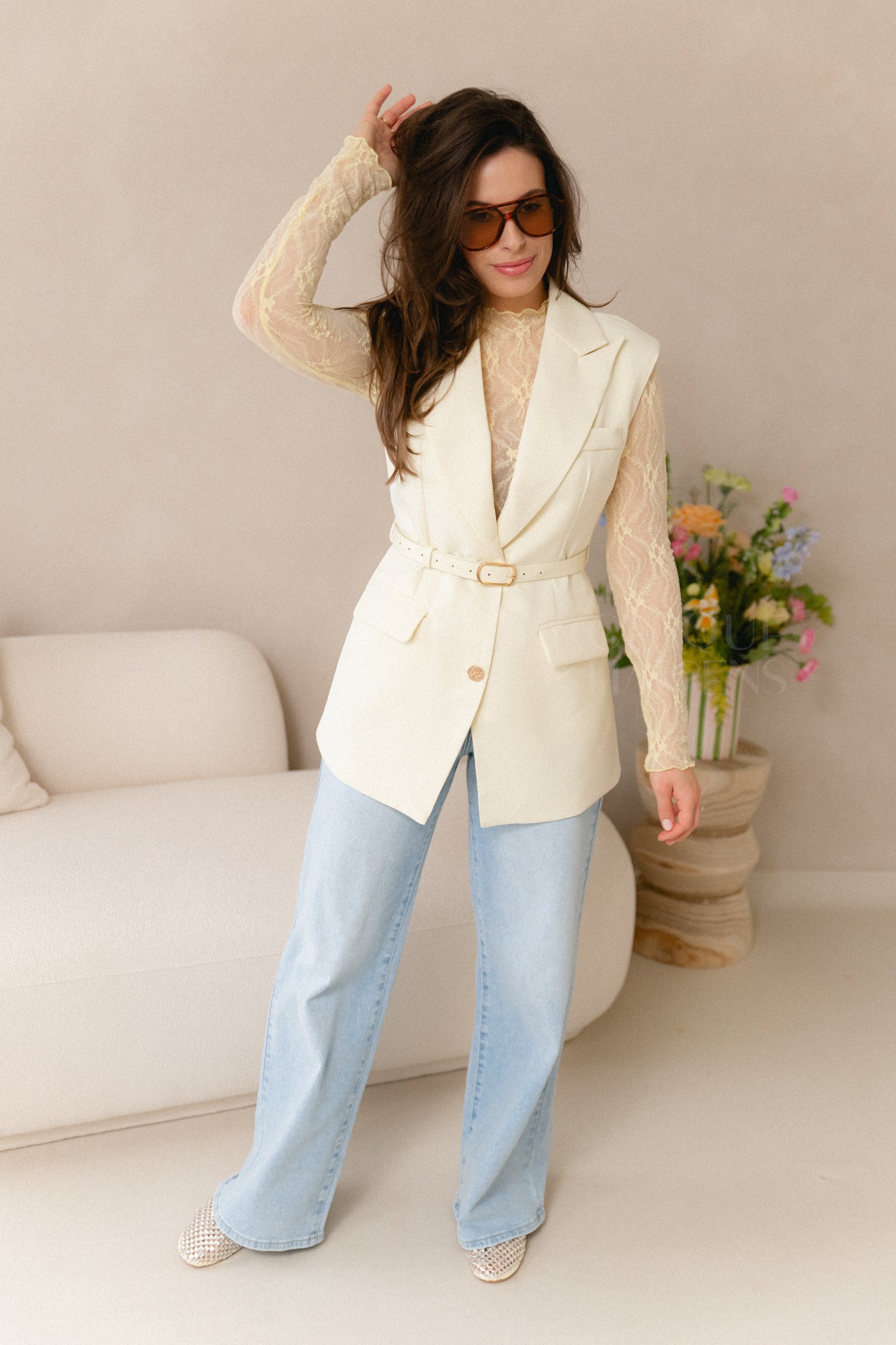 Ontelbaar veel combineeropties met deze mooie kanten blouse. Het kanten blousje combineert prachtig met onze pastelgele mouwloze blazer.