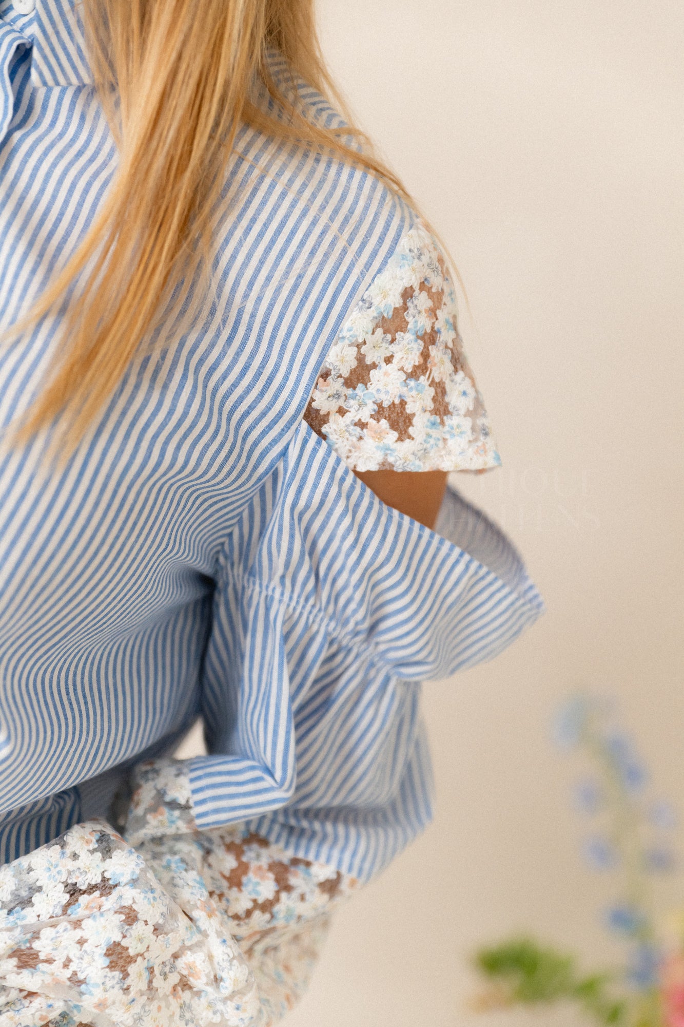 Een delicate hemdblouse van fijne voile met unieke, speelse mouwen en subtiele bloemendetails. Licht, luchtig en elegant voor een vrouwelijke, verfijnde look. 🌸