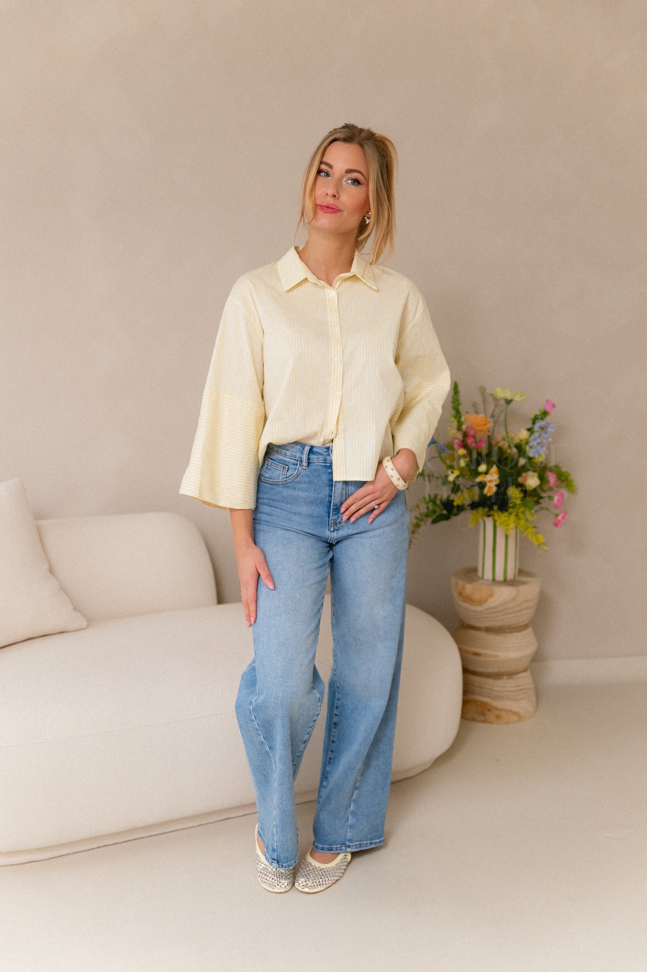 Een kort hemdje met wit-lichtgele strepen en bredere mouwen voor een frisse, speelse look. Supertof en makkelijk te stylen.